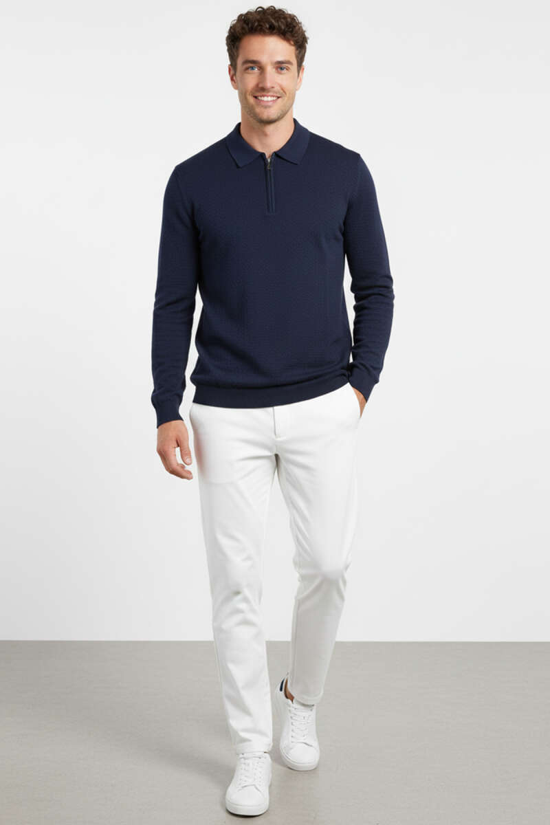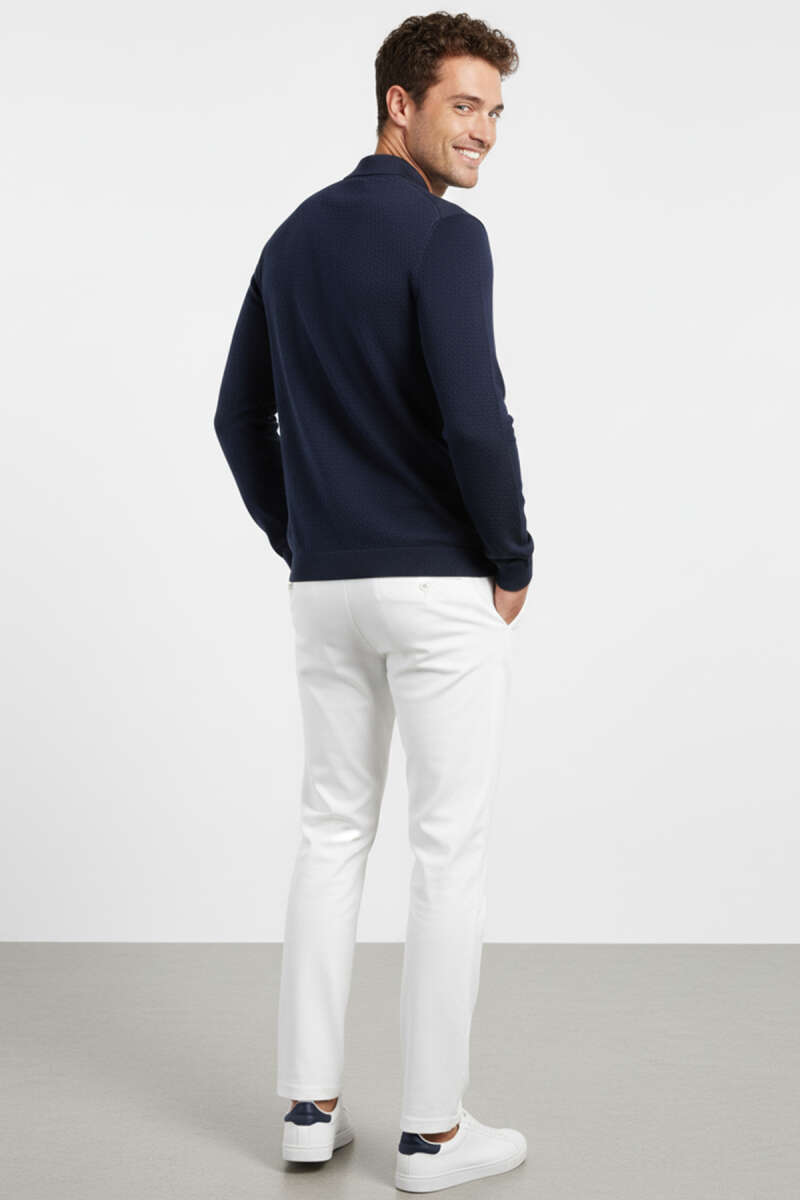 Yaka Fermuarlı Triko Erkek Kazak Beyaz