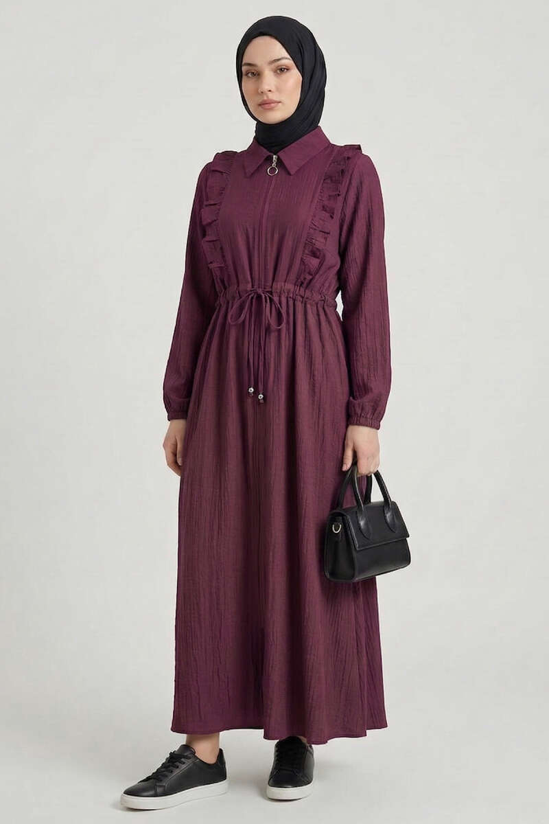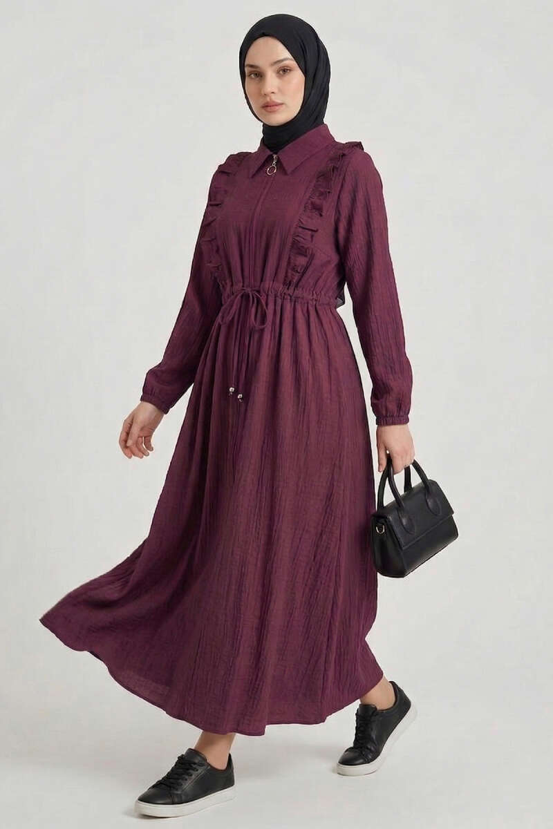 Yaka Fırfırlı Bel Tünelli Elbise Bordo