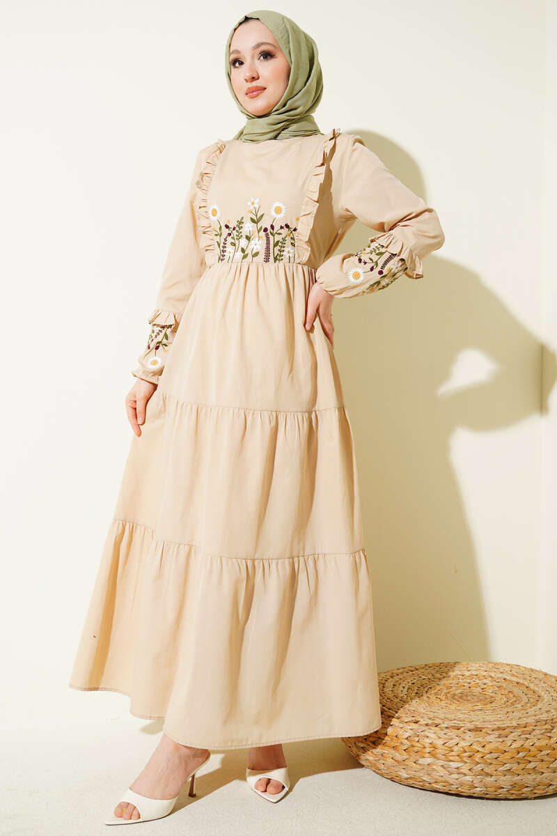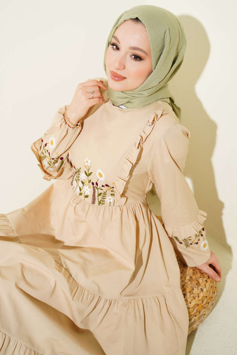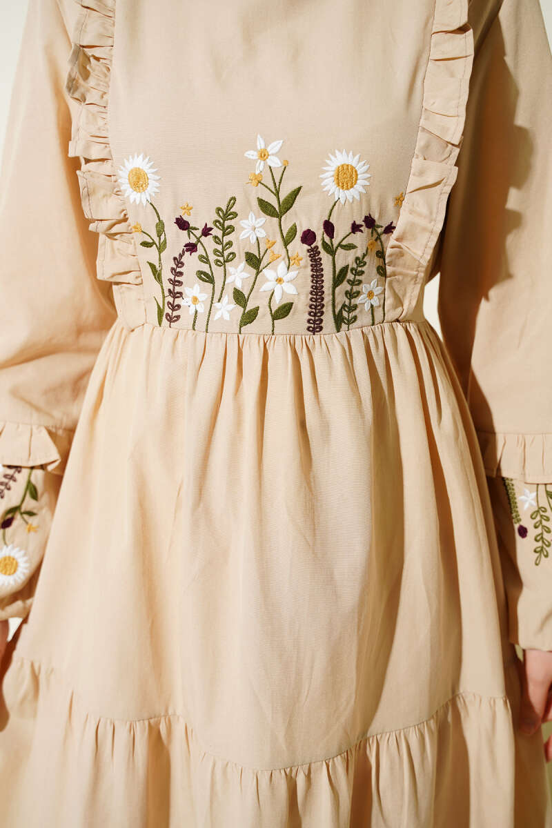 Yaka Fırfırlı Nakışlı Poplin Elbise Bej