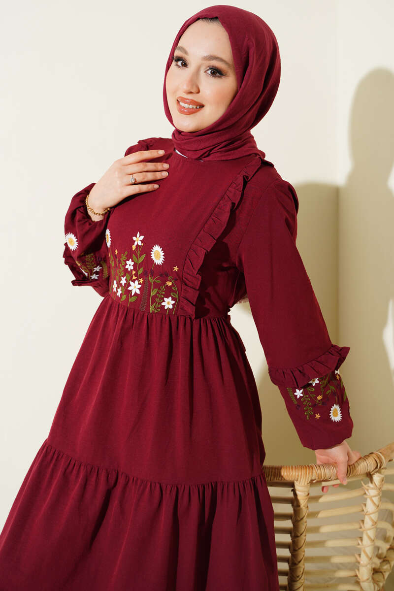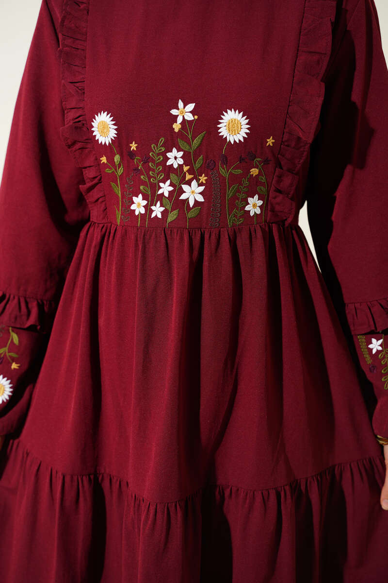 Yaka Fırfırlı Nakışlı Poplin Elbise Bordo