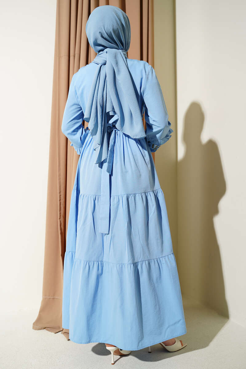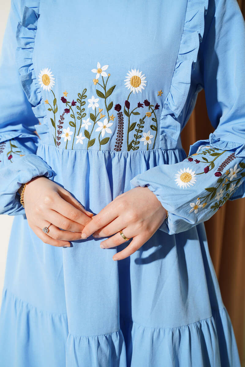Yaka Fırfırlı Nakışlı Poplin Elbise Buz Mavisi