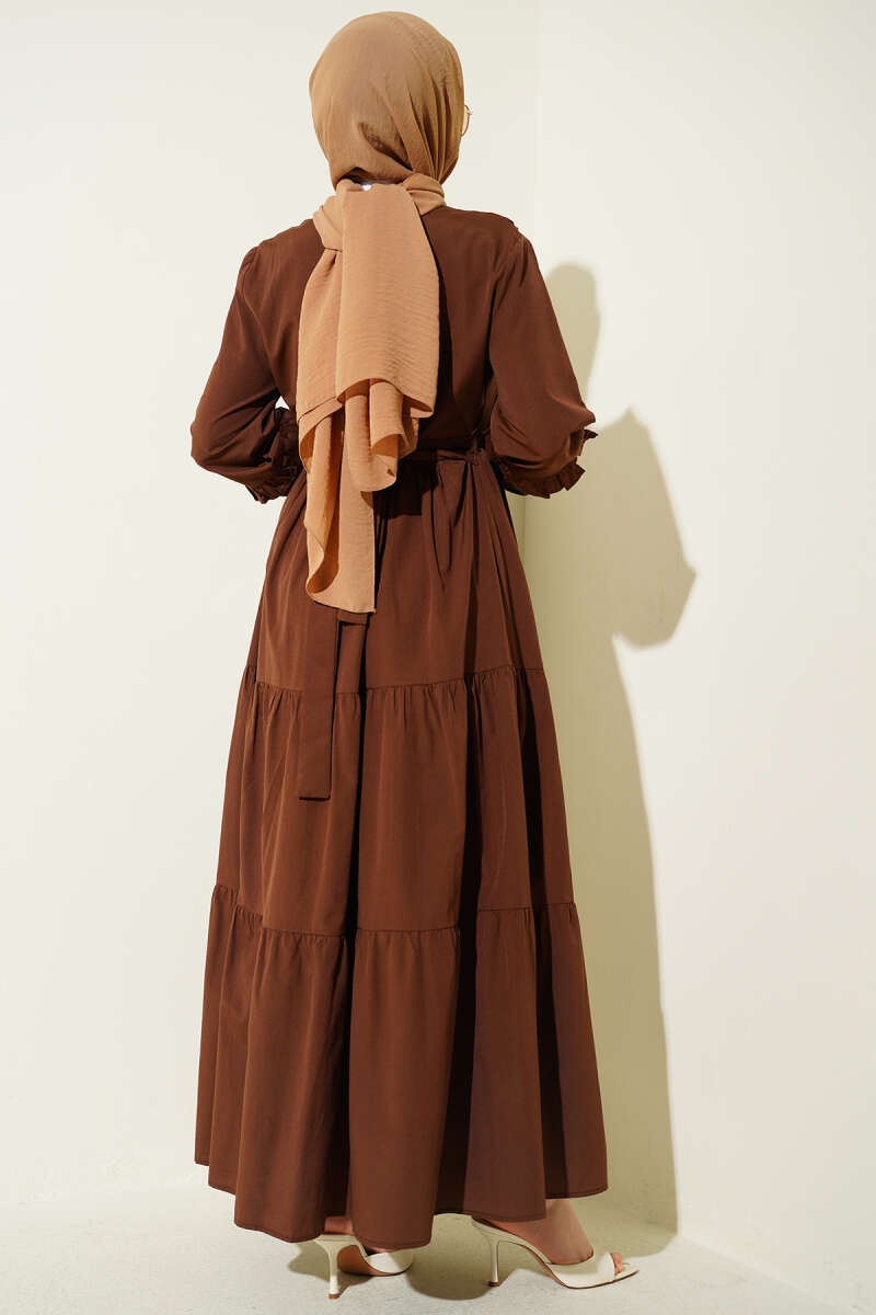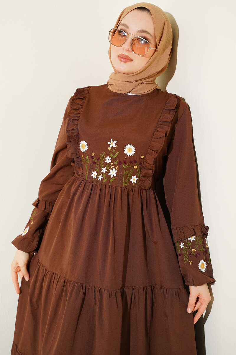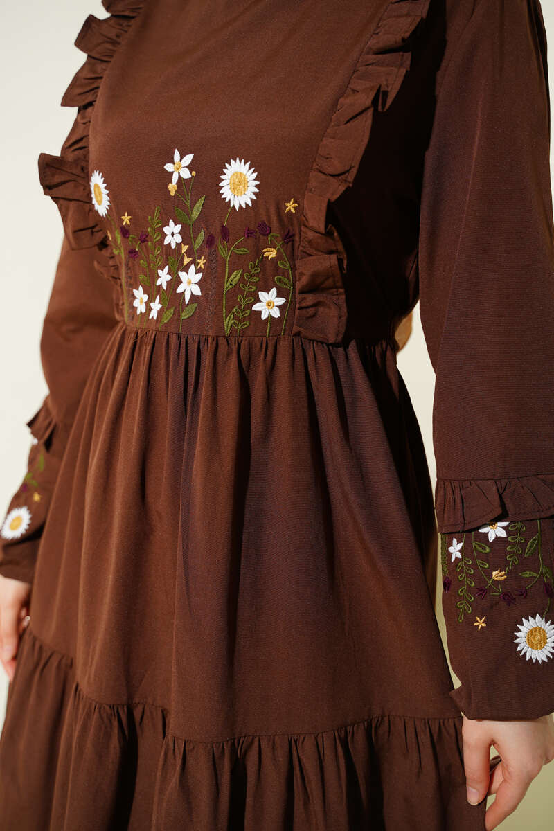 Yaka Fırfırlı Nakışlı Poplin Elbise Kahve