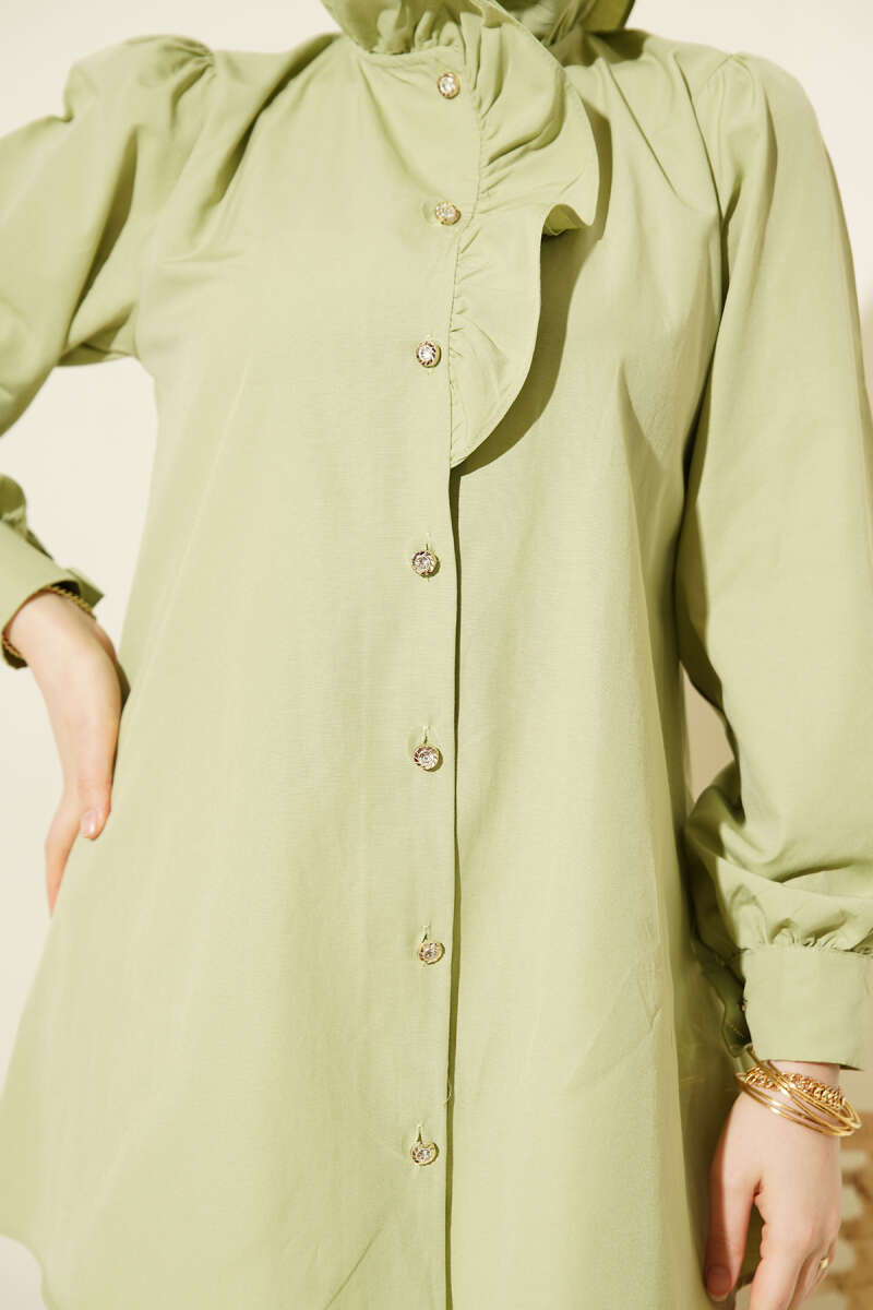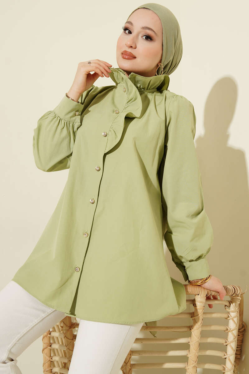 Yaka Fırfırlı Taş Düğmeli Gömlek Çağla Yeşili