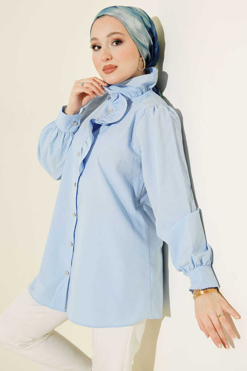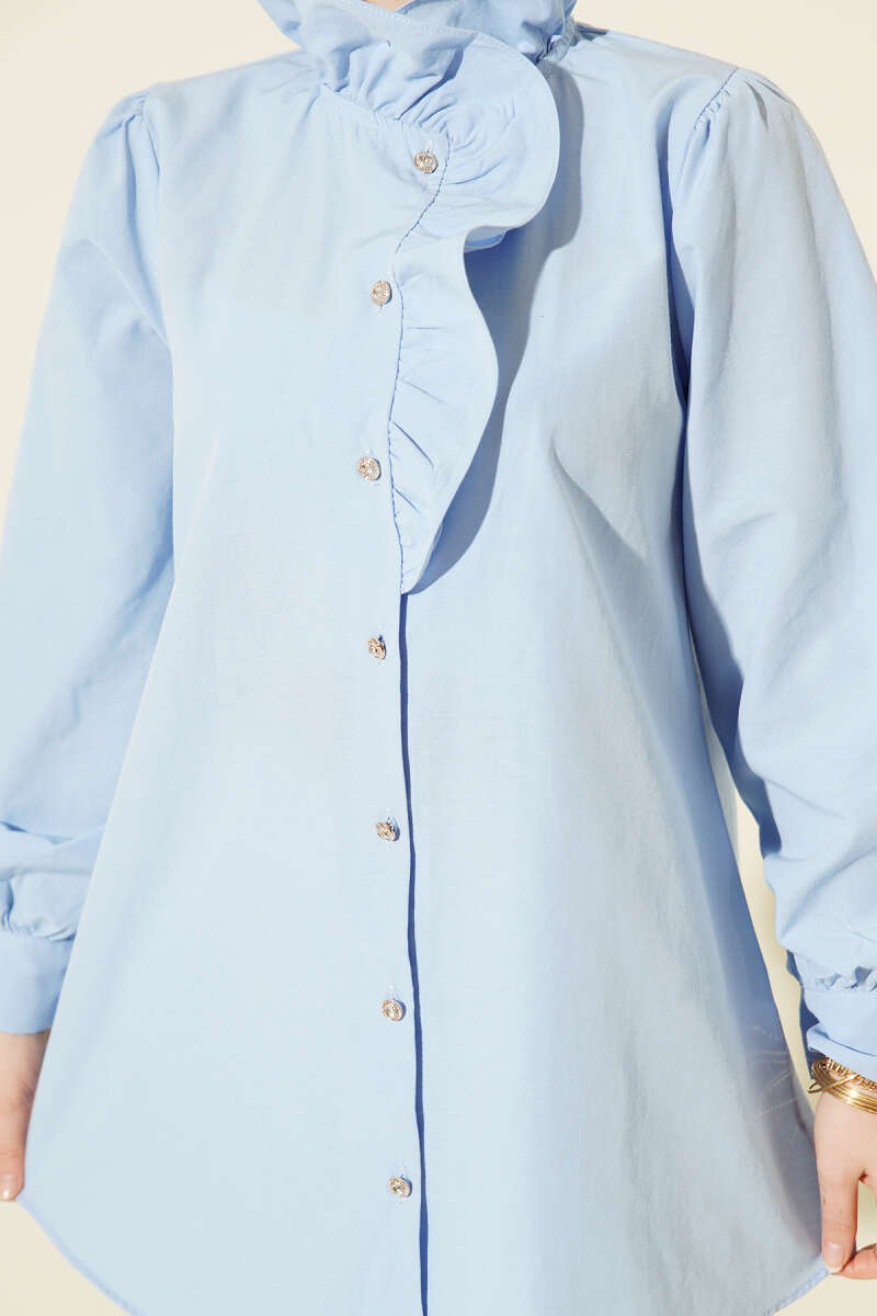 Yaka Fırfırlı Taş Düğmeli Gömlek Mavi