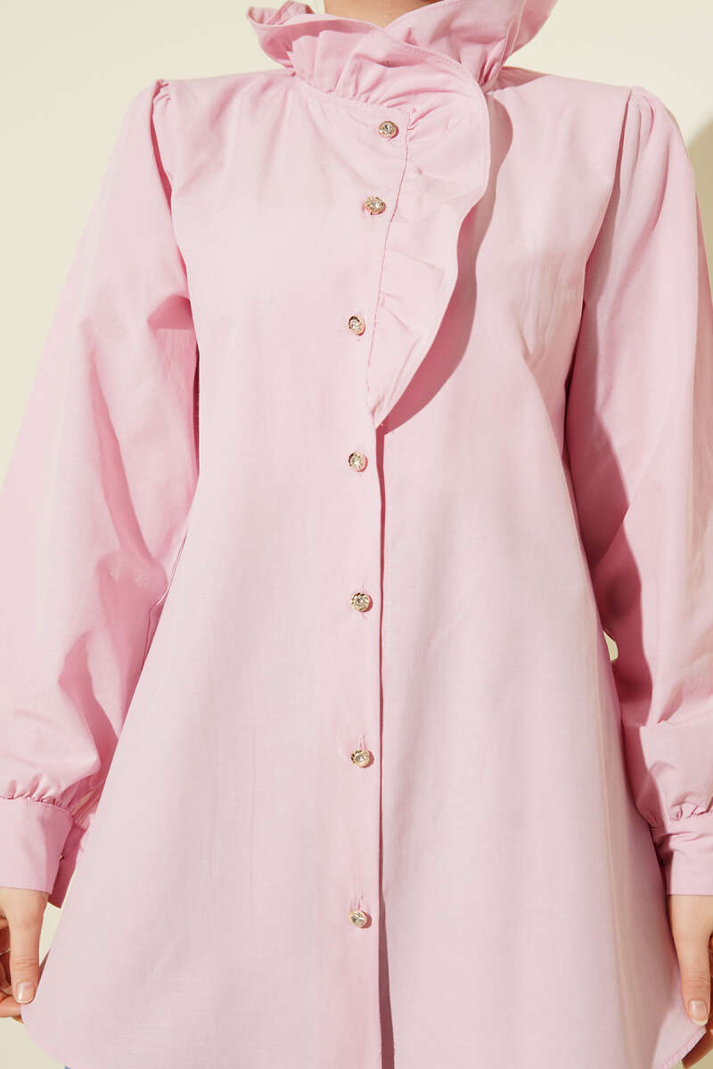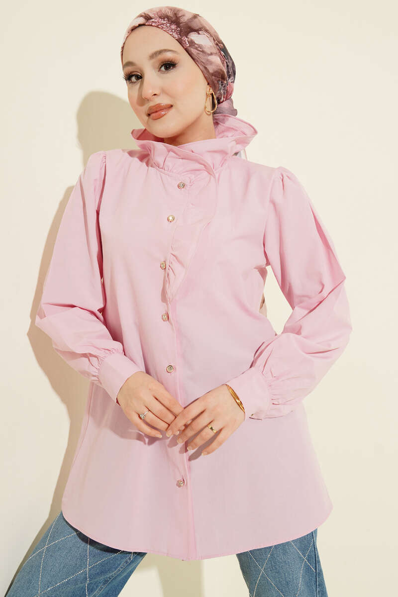 Yaka Fırfırlı Taş Düğmeli Gömlek Pembe