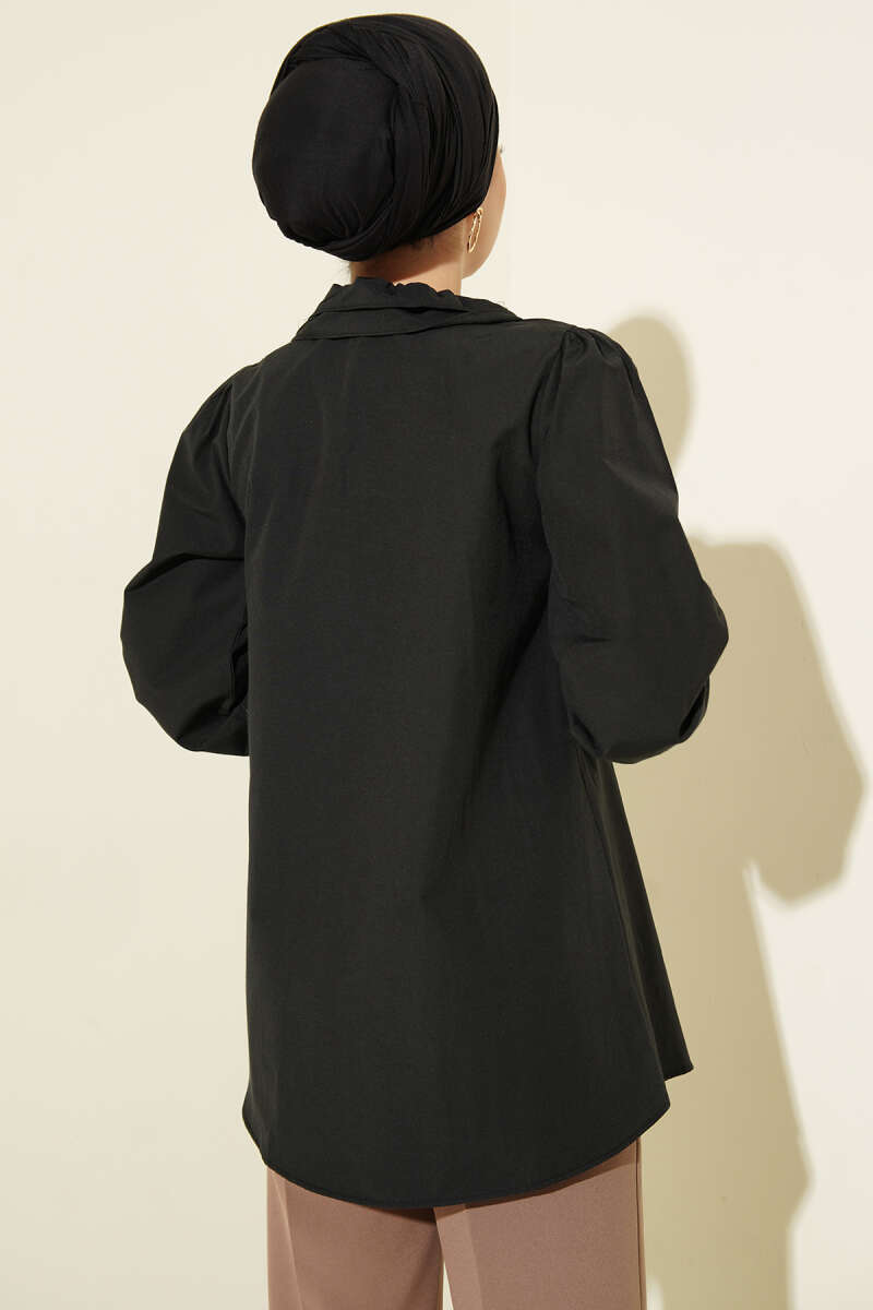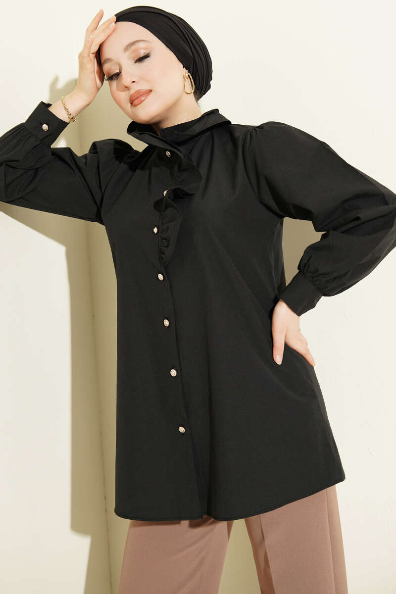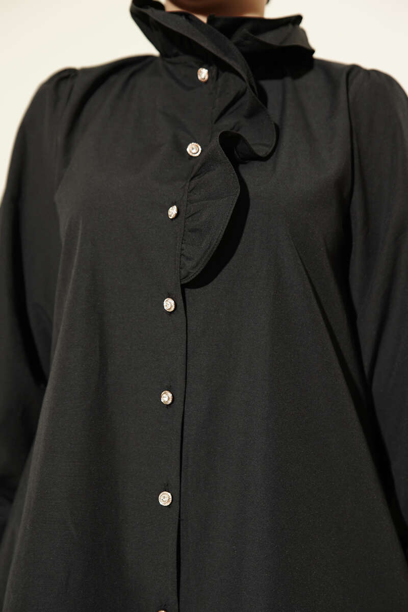 Yaka Fırfırlı Taş Düğmeli Gömlek Siyah