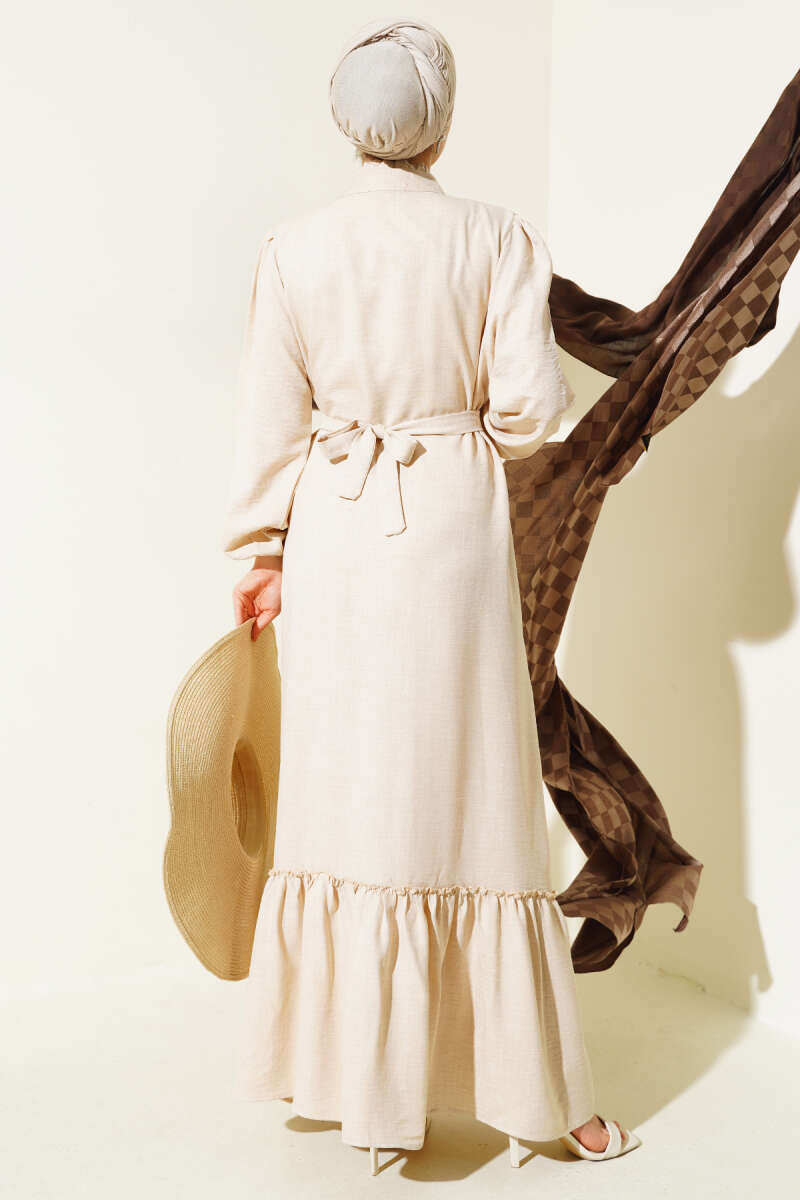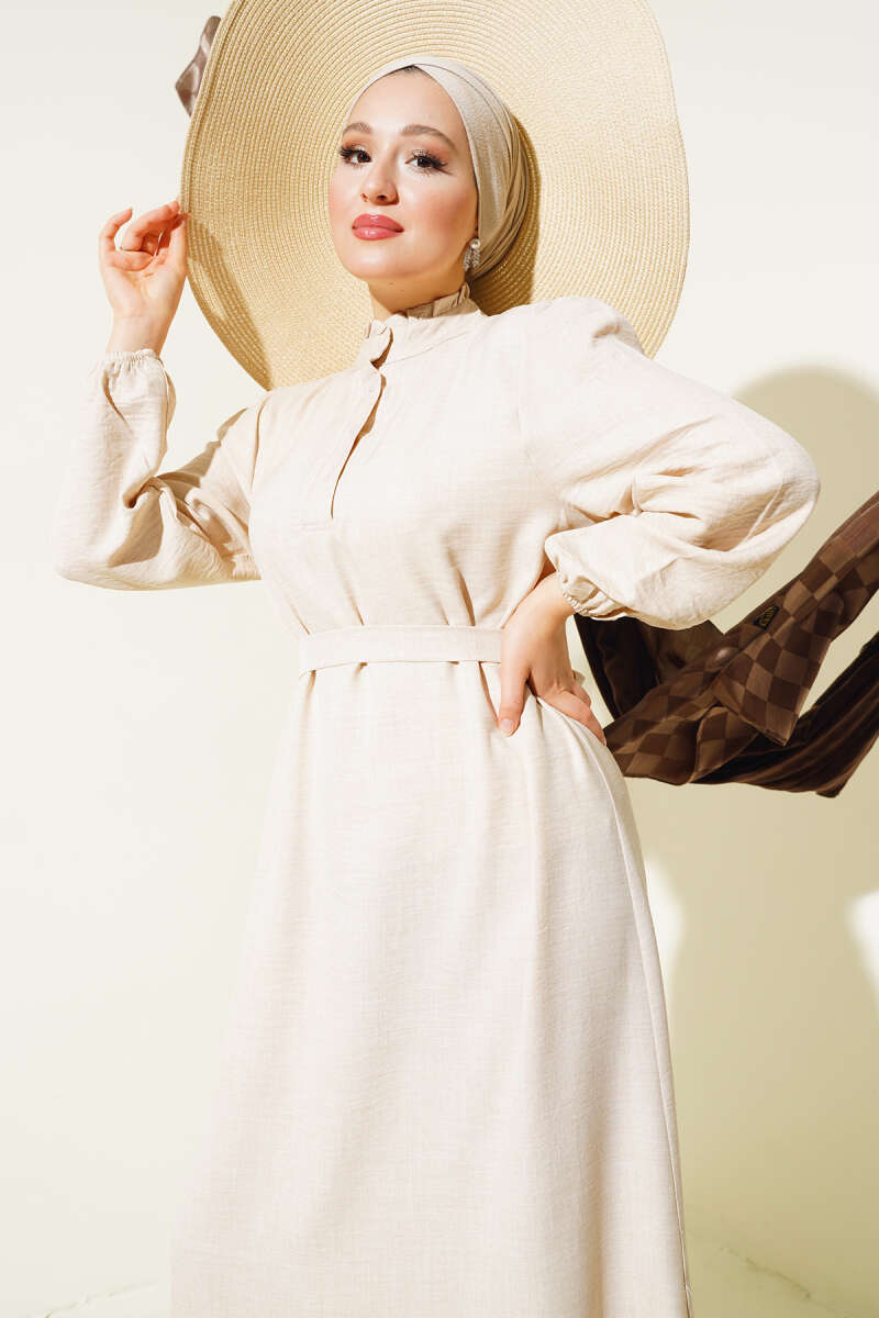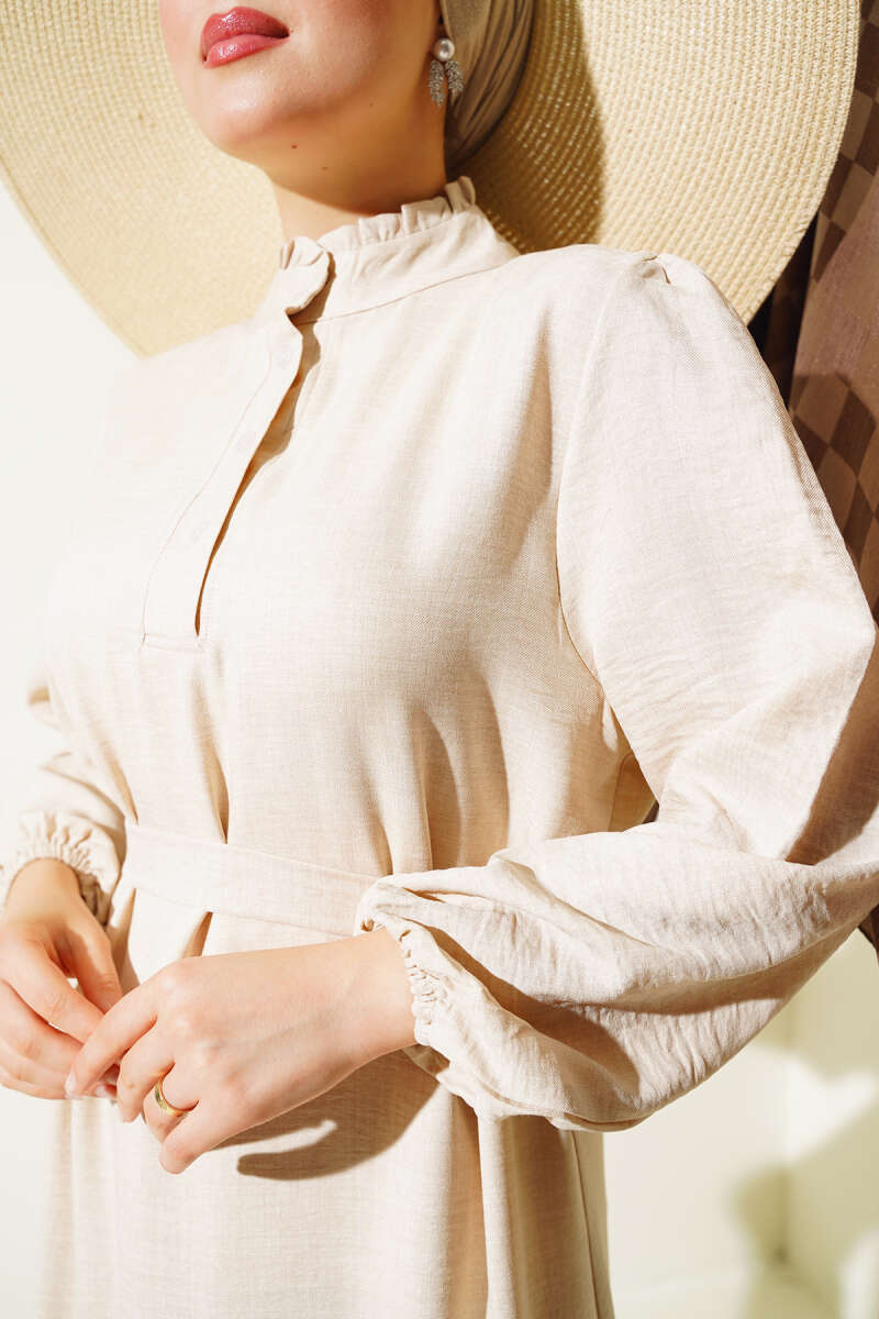 Bel Tünelli Düğmeli Ağaç Kabuğu Elbise Çağla Yeşili