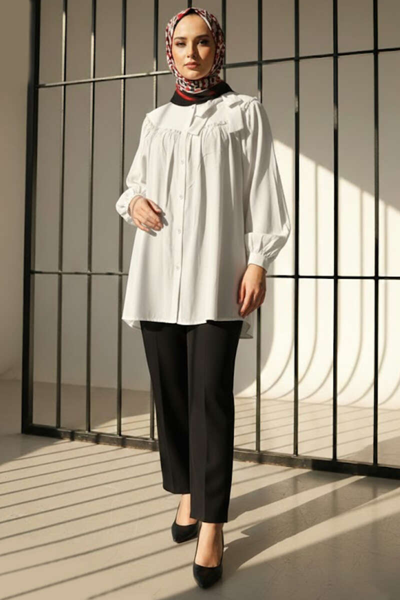 Yaka Fiyonklu Salaş Gömlek Beyaz