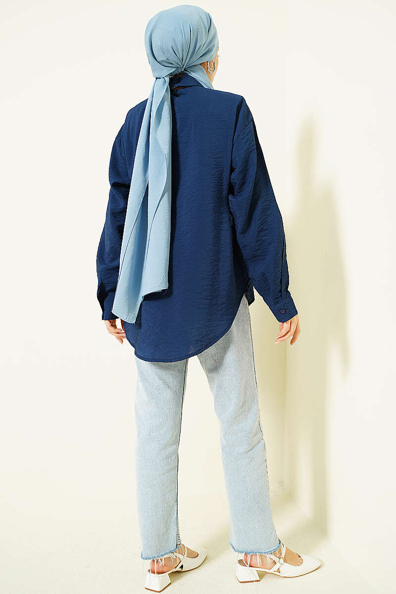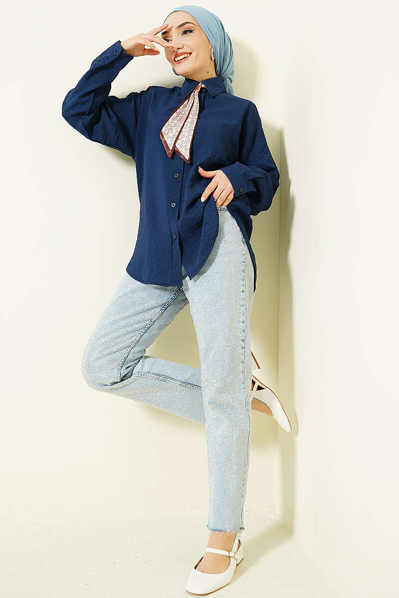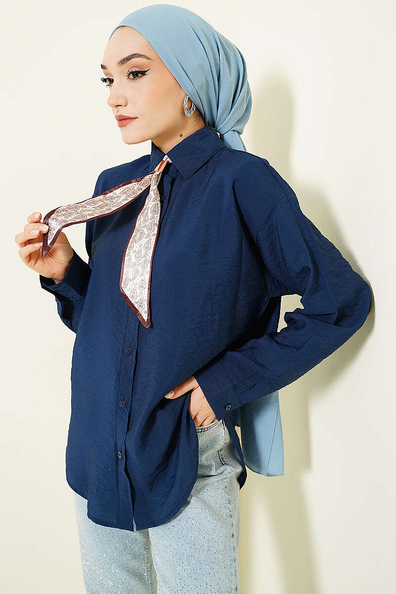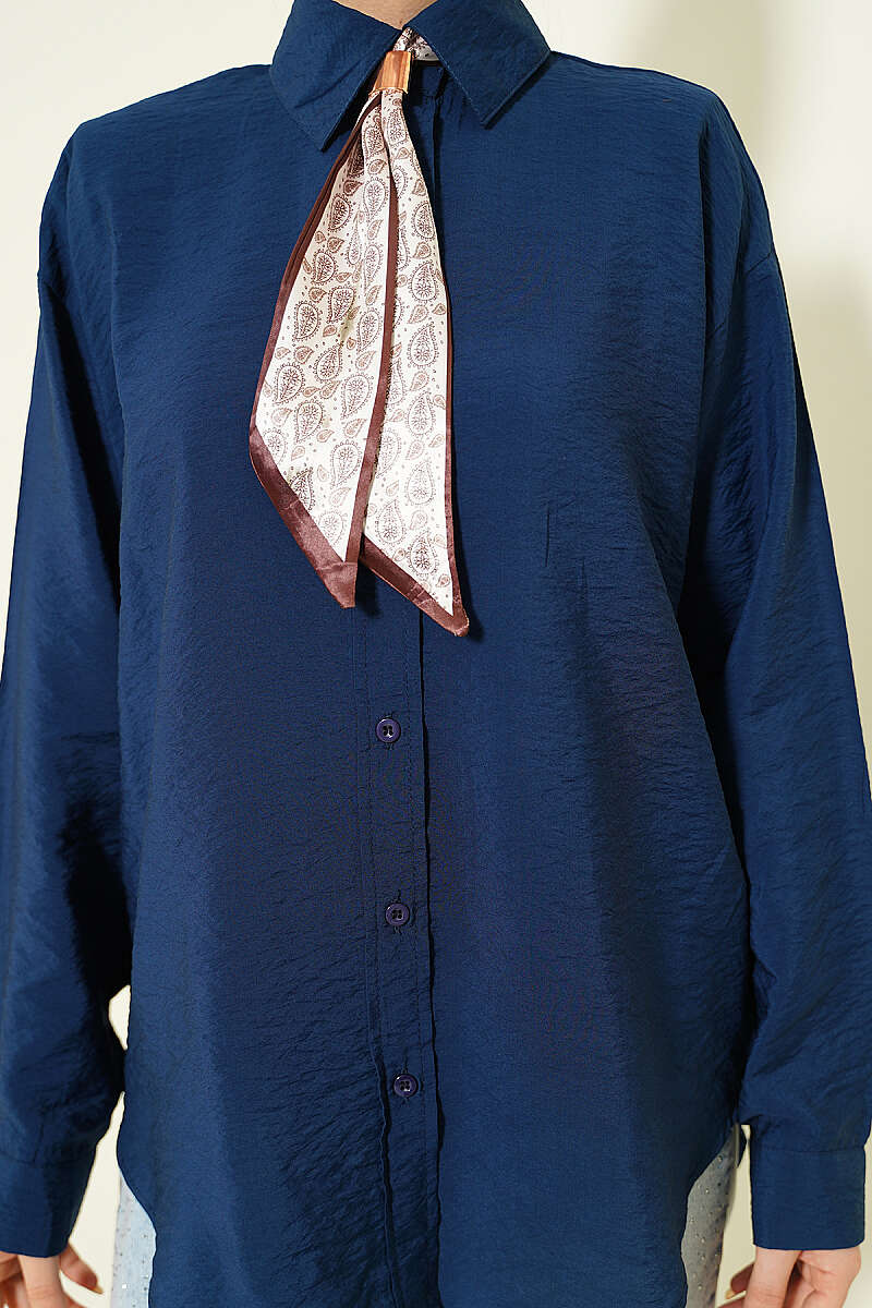 Çift Yaka İp Kuşaklı Gömlek Lacivert