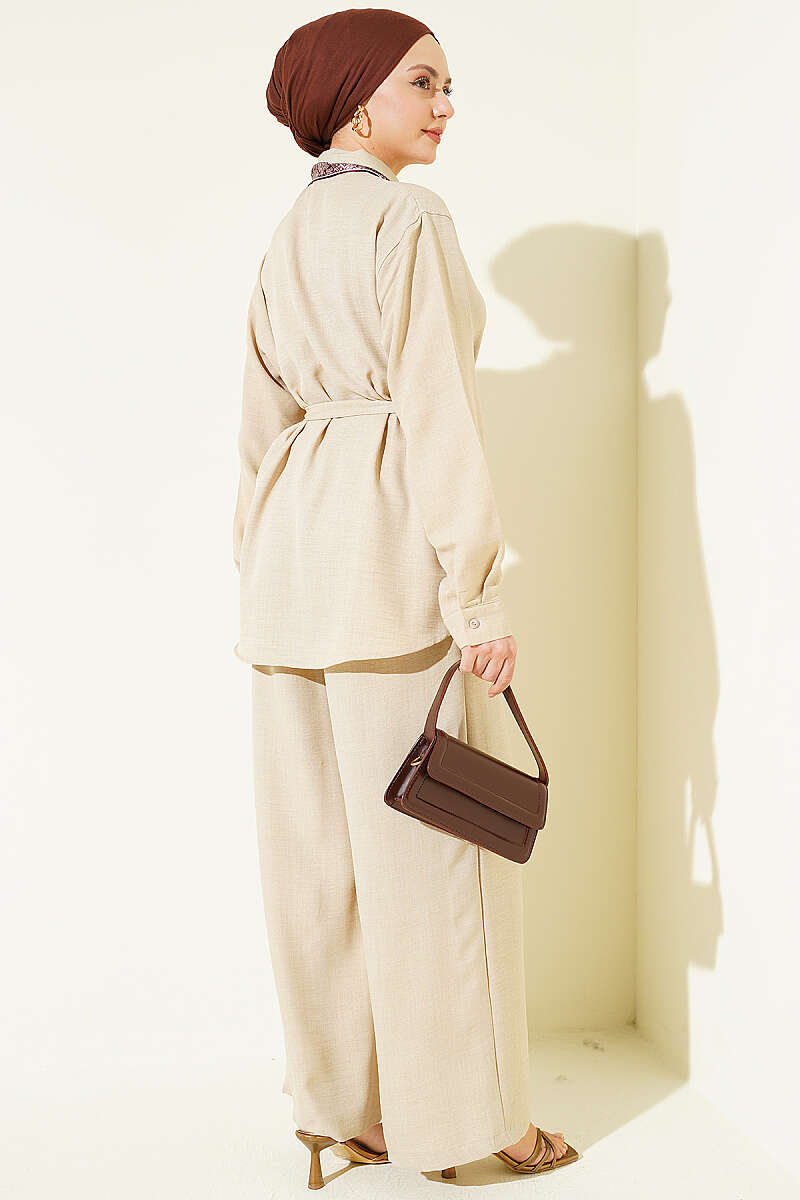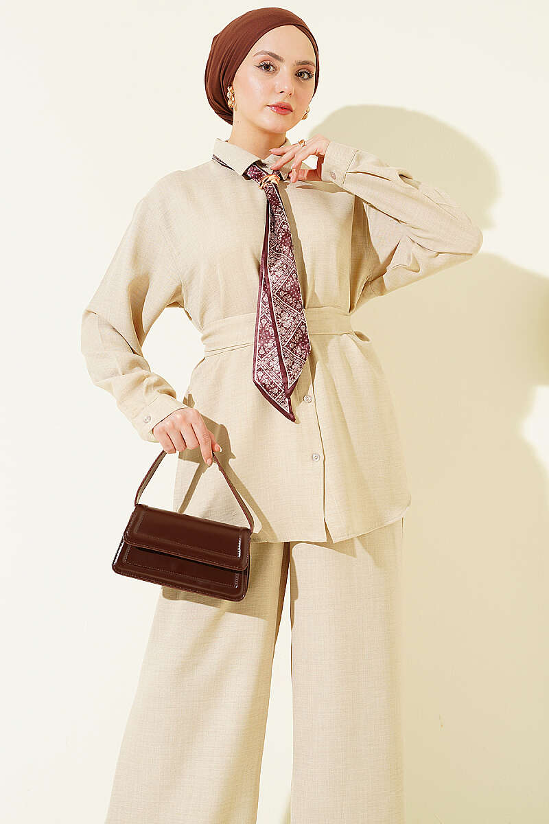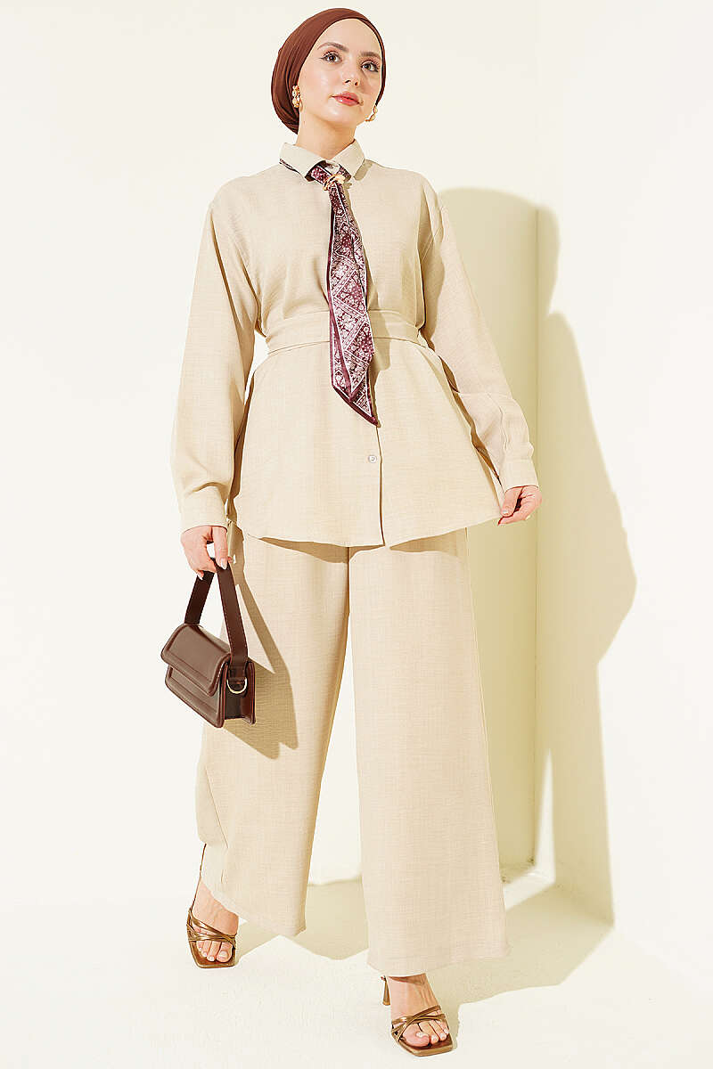 Yaka Fularlı Kuşaklı Salaş İkili Takım Bej