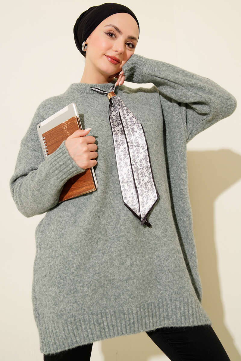 Basic Bisiklet Yaka Düz Triko Tunik Yağ Yeşili