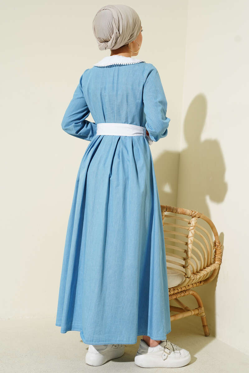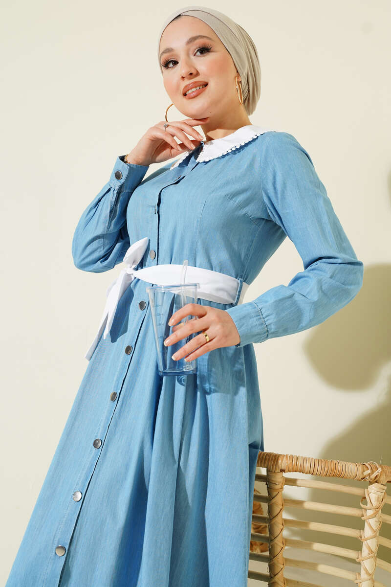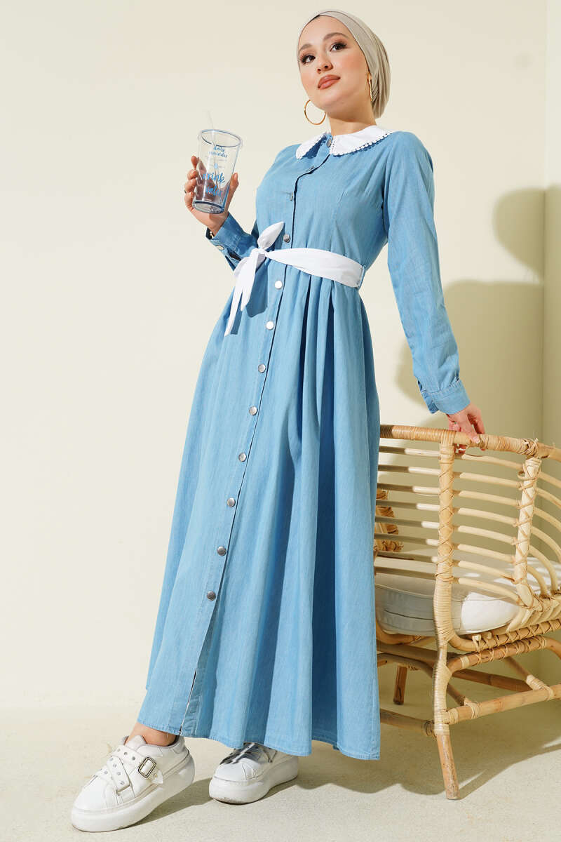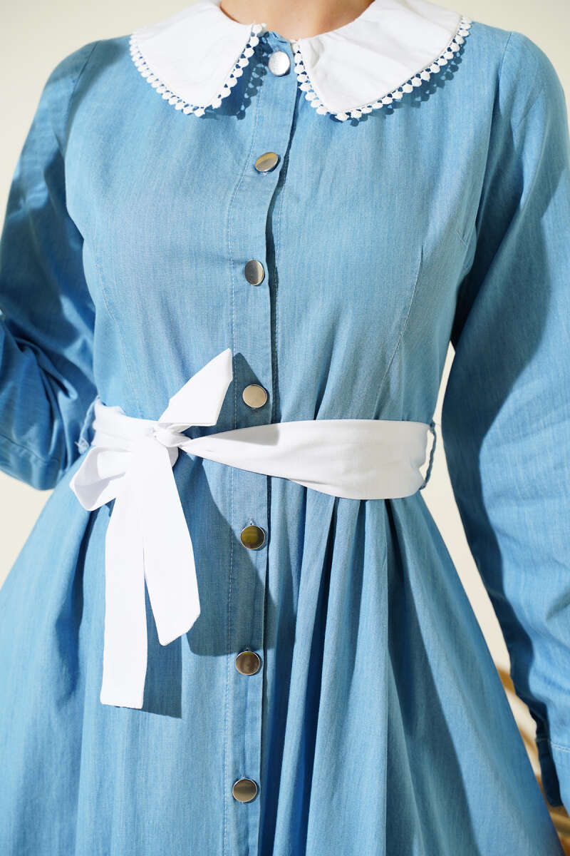 Yaka Garnili Boydan Metal Düğmeli Elbise Açık Mavi