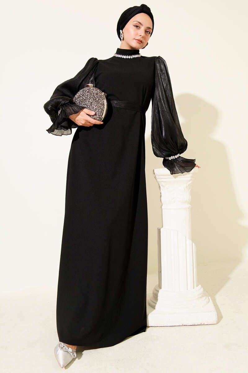 Yaka İnci Detaylı Kuşaklı Abiye Elbise Siyah