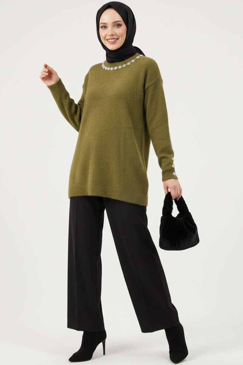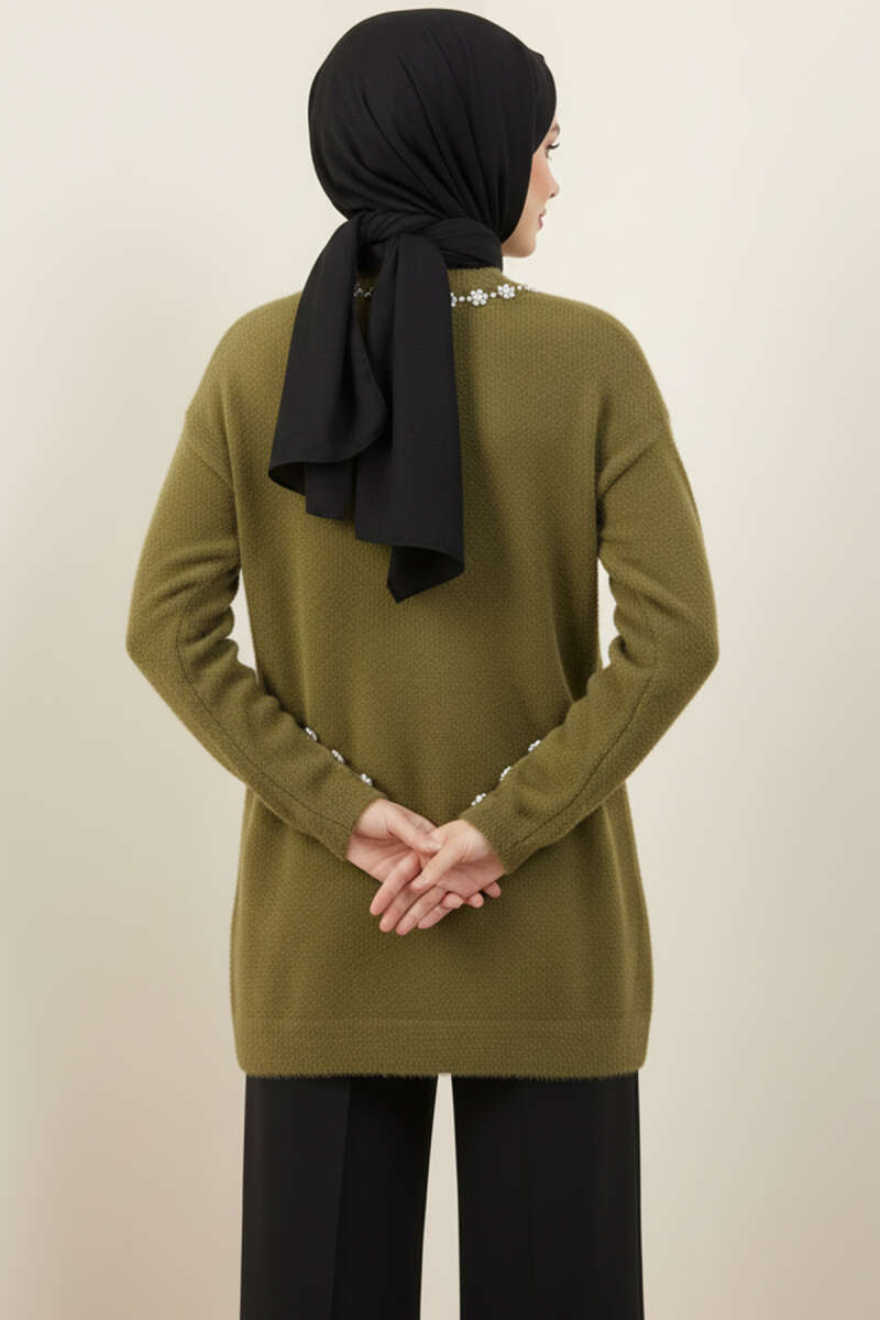 Tül Çiçekli İncili Triko İkili Takım Bej