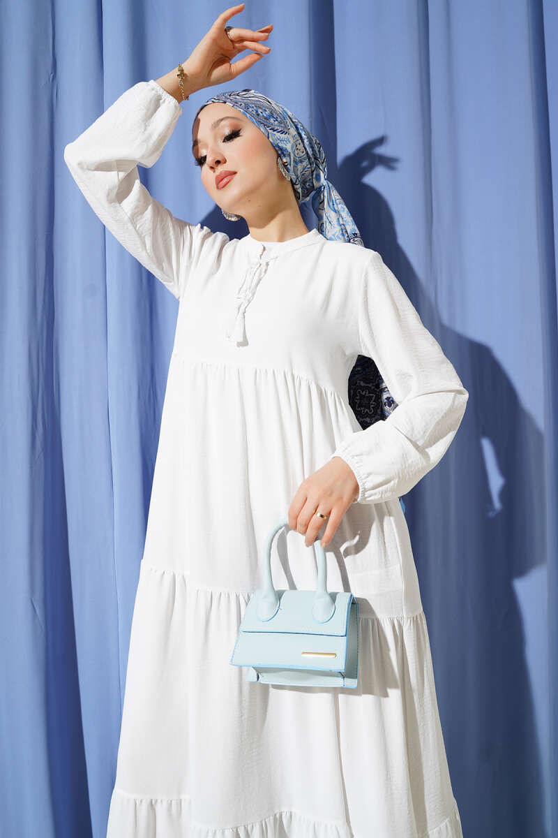 Yaka İp Bağcık Detaylı Kat Elbise Beyaz