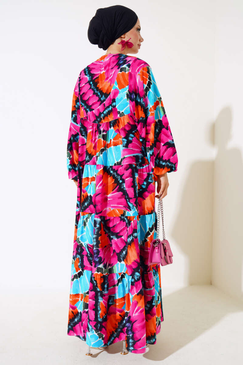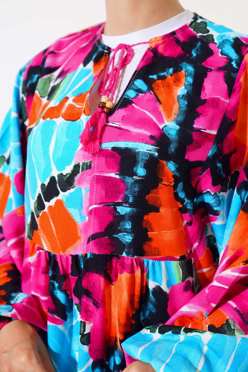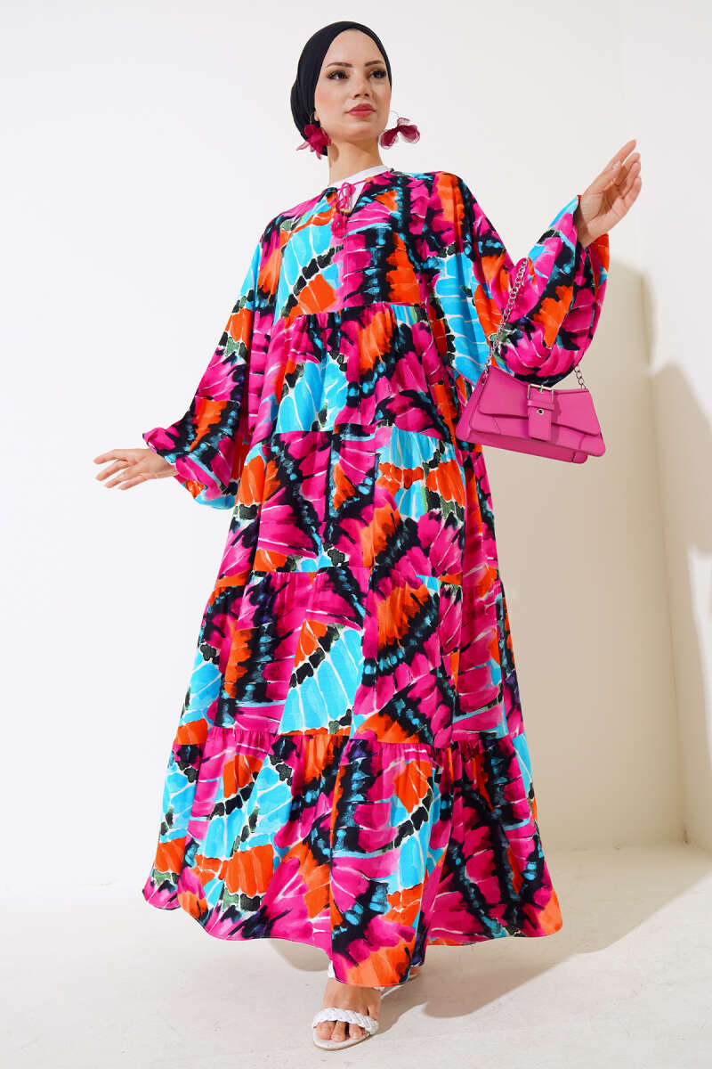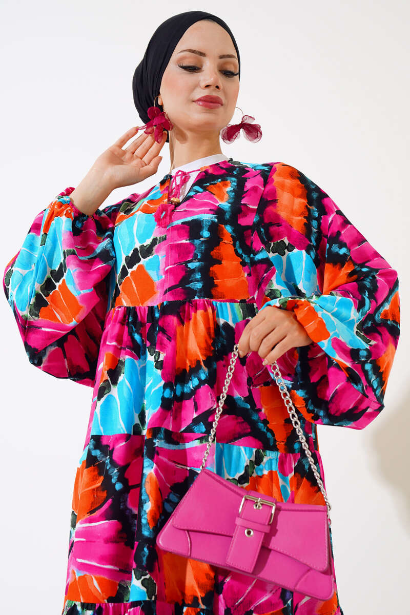 Yaka İpli Yarasa Kol Elbise Fuşya