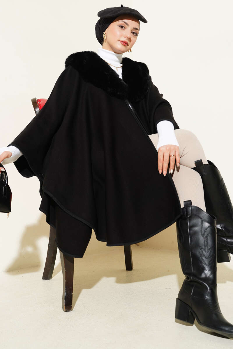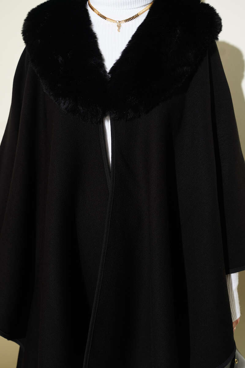 Angora Detaylı Yaka Düğmeli Panço Siyah Bej