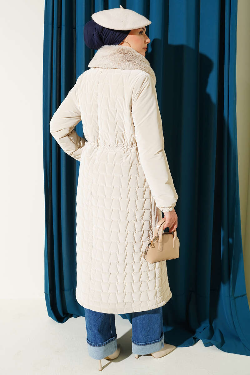 Yaka Kürklü Bel Tünelli Kapitone Uzun Mont Kahve