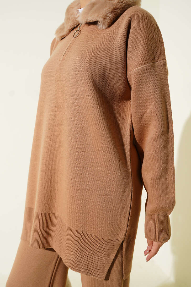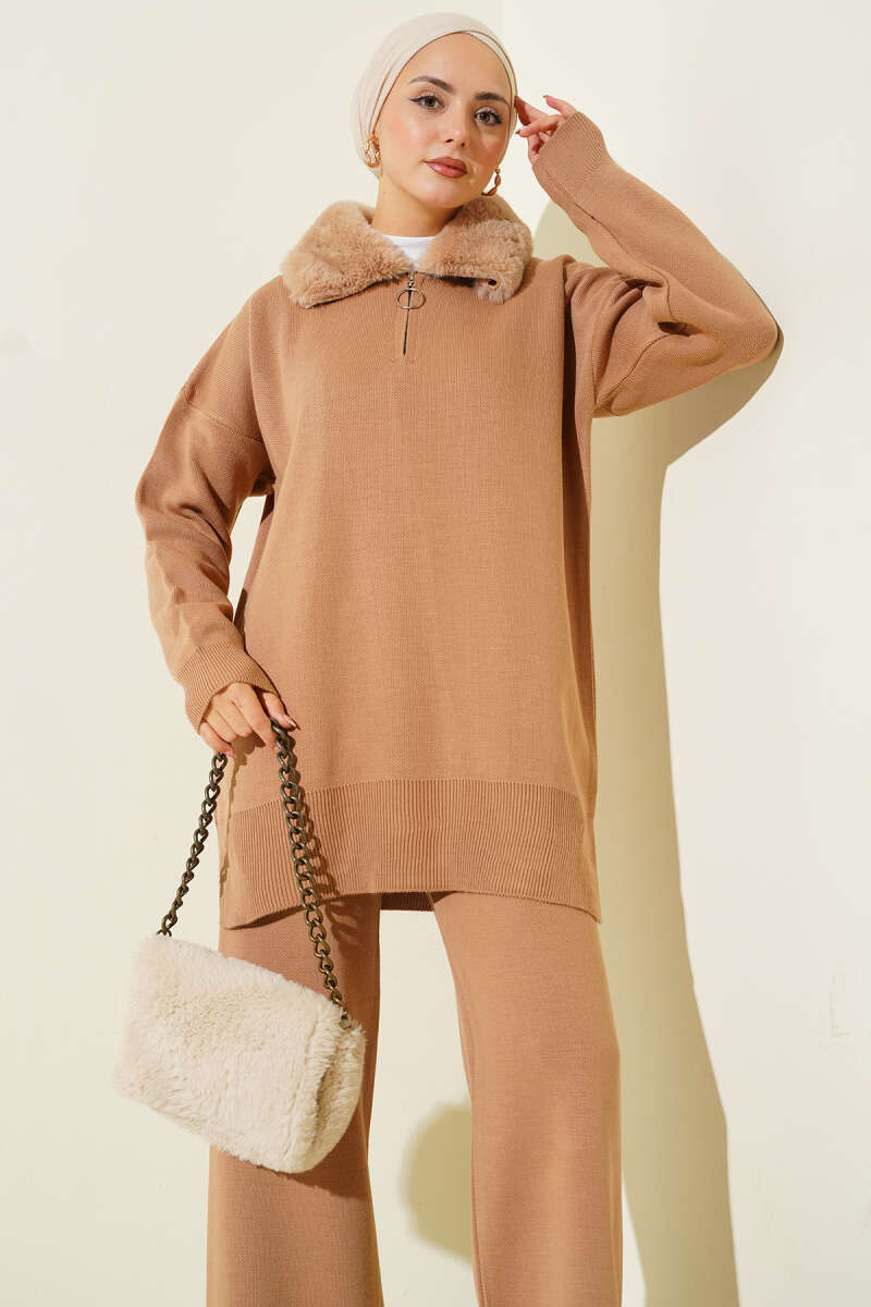 Yaka Kürklü Fermuarlı Triko İkili Takım Taba