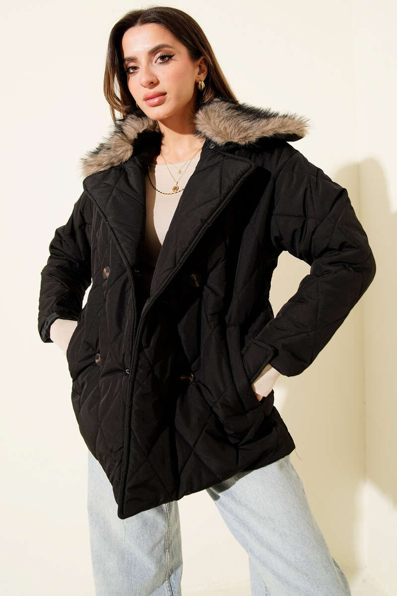 Degaje Yaka Taşlı Vatkalı Elbise Siyah
