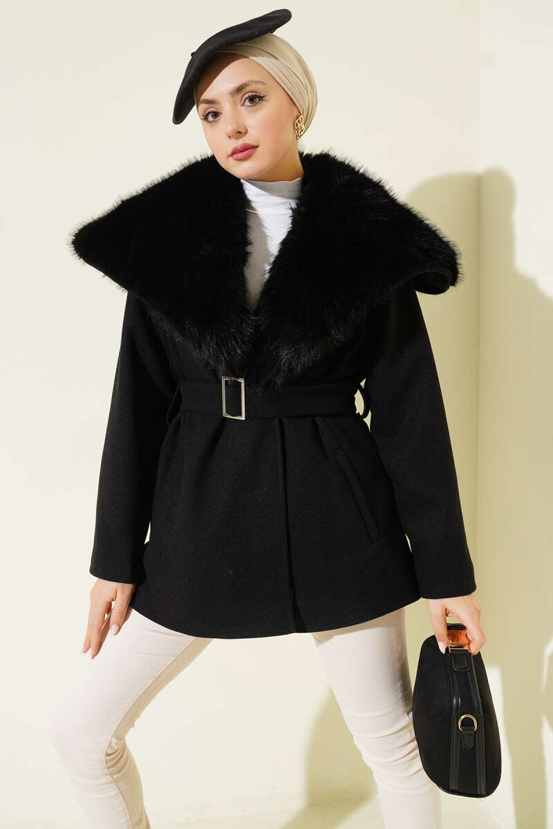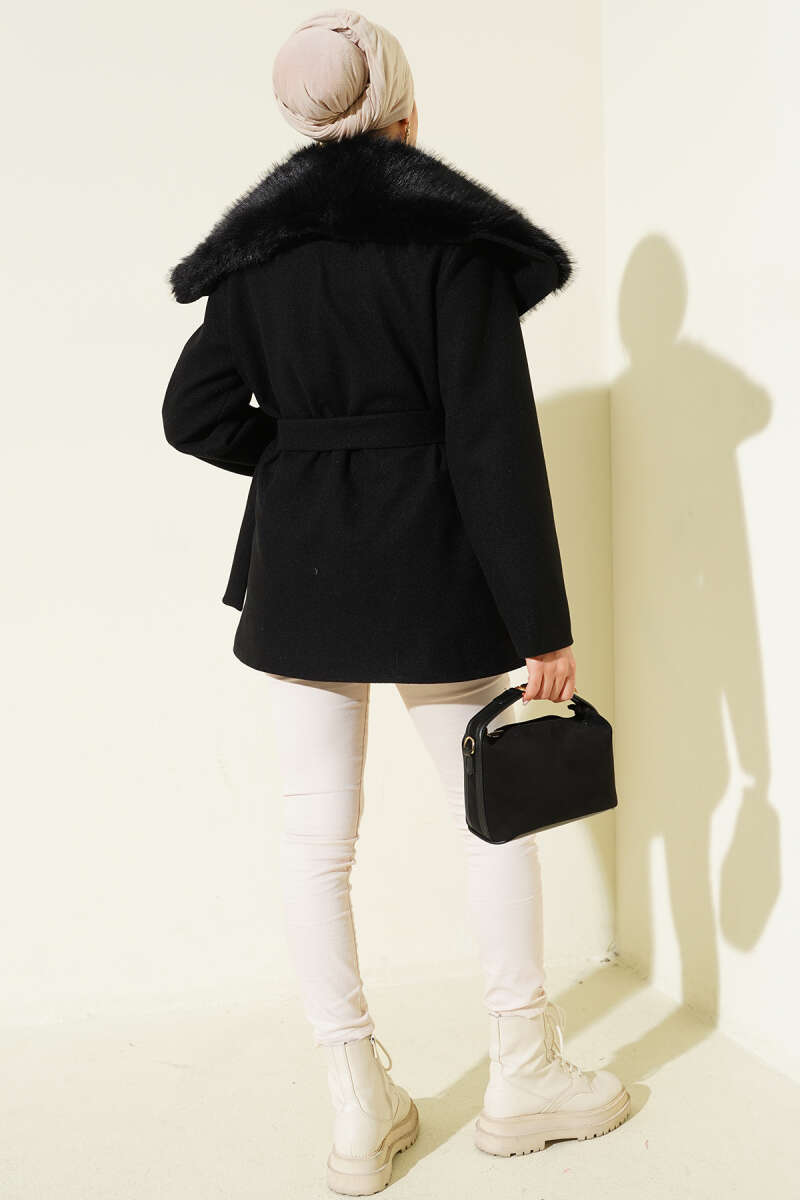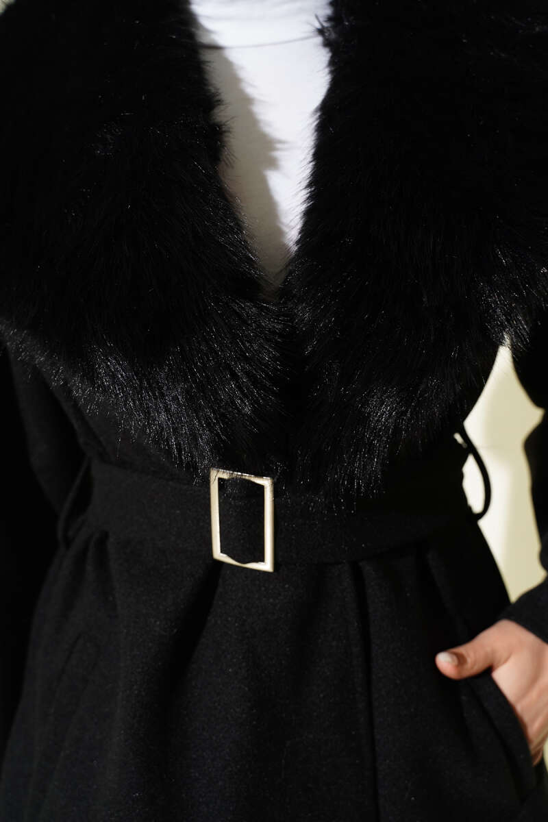 Yaka Kürklü Kuşaklı Kaşe Kaban Füme