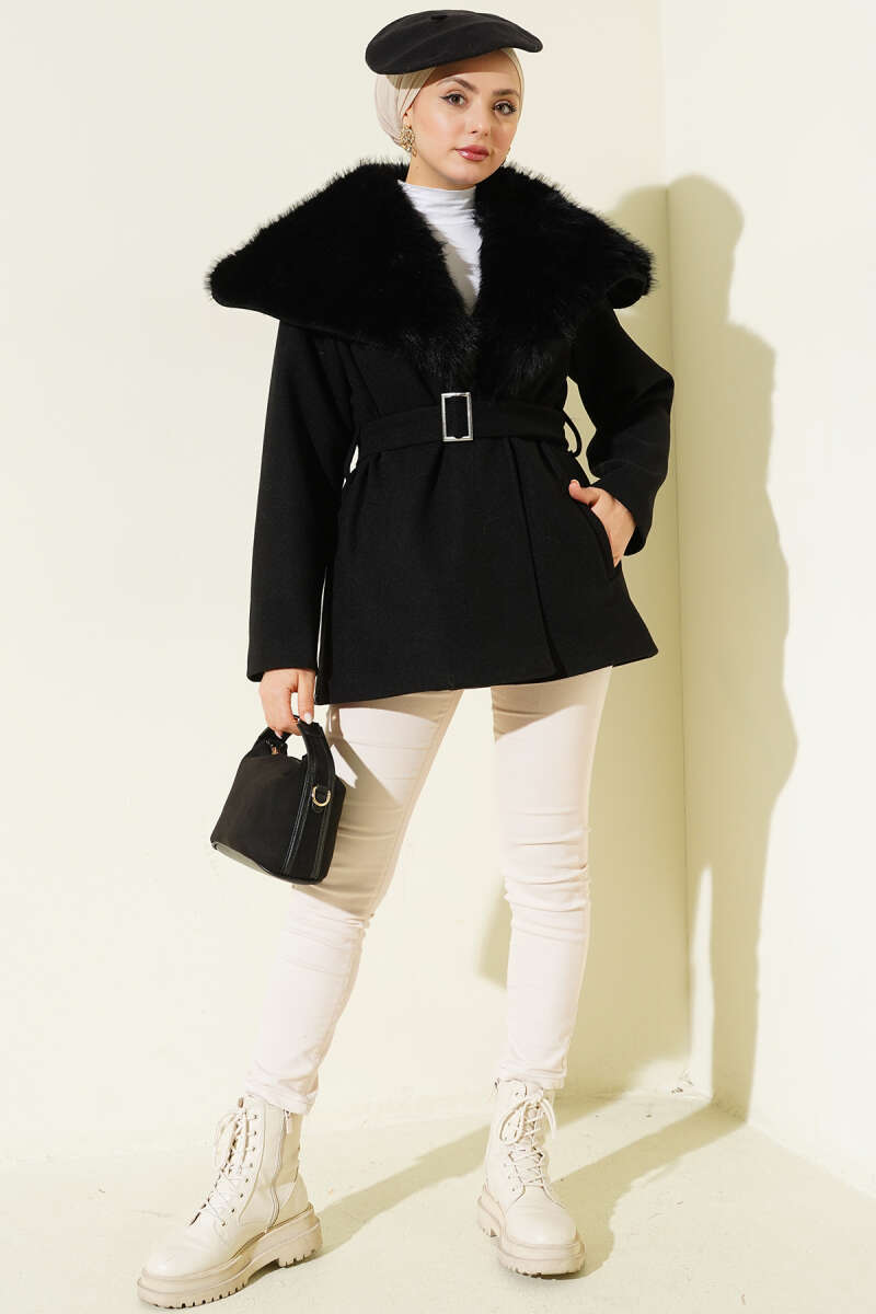 Kruvaze Yaka Kuşaklı Astarlı Kaban Siyah