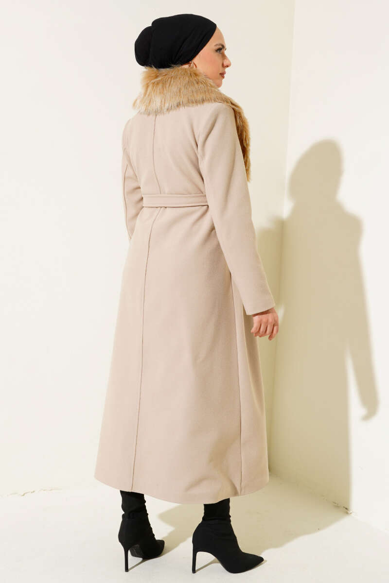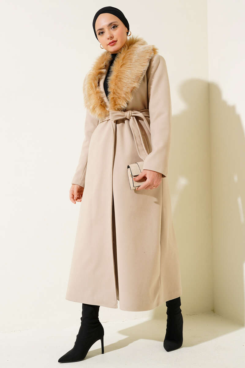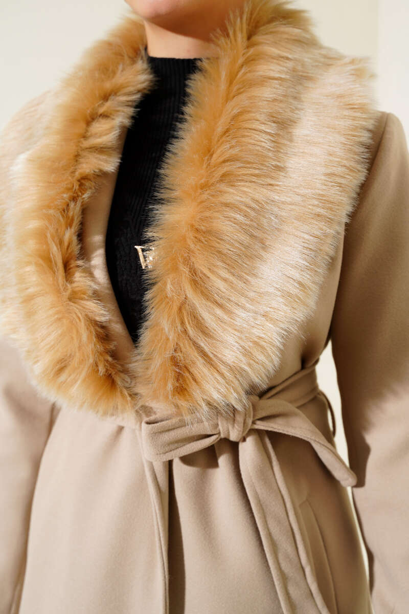 Bebe Yaka Kuşaklı Kaşe Kaban Taba