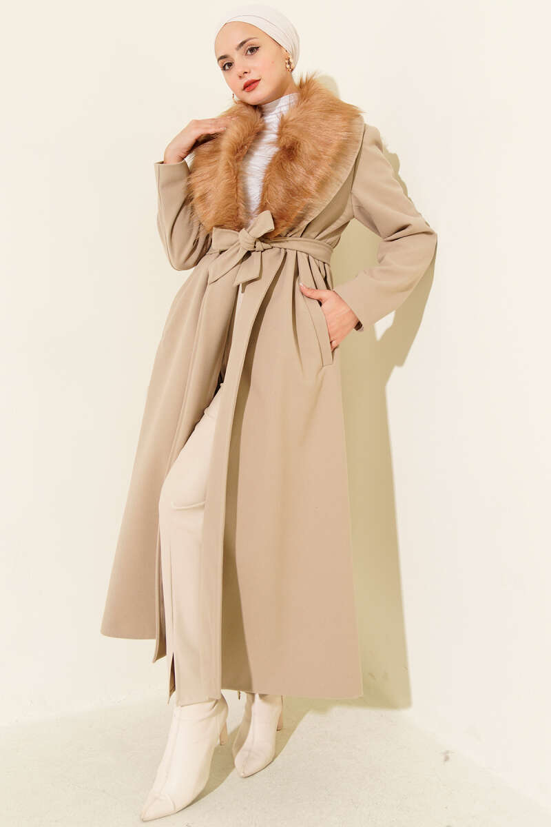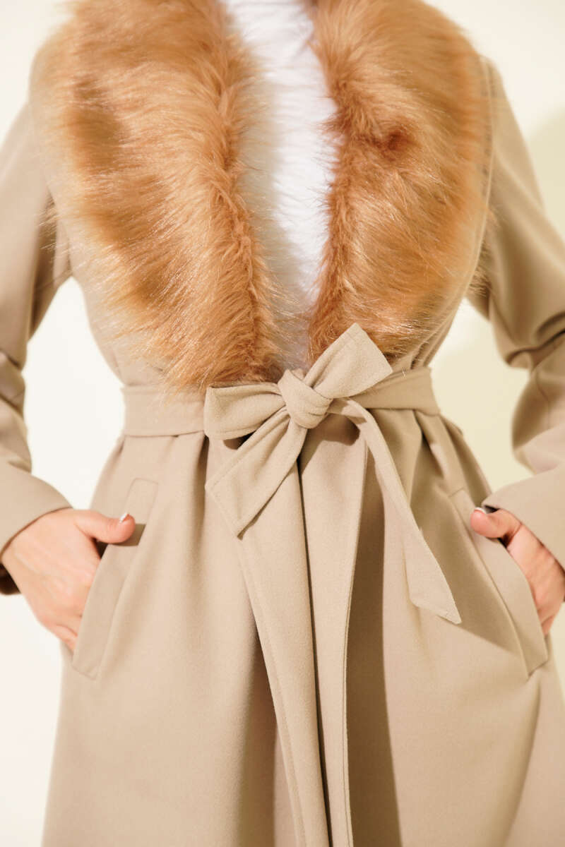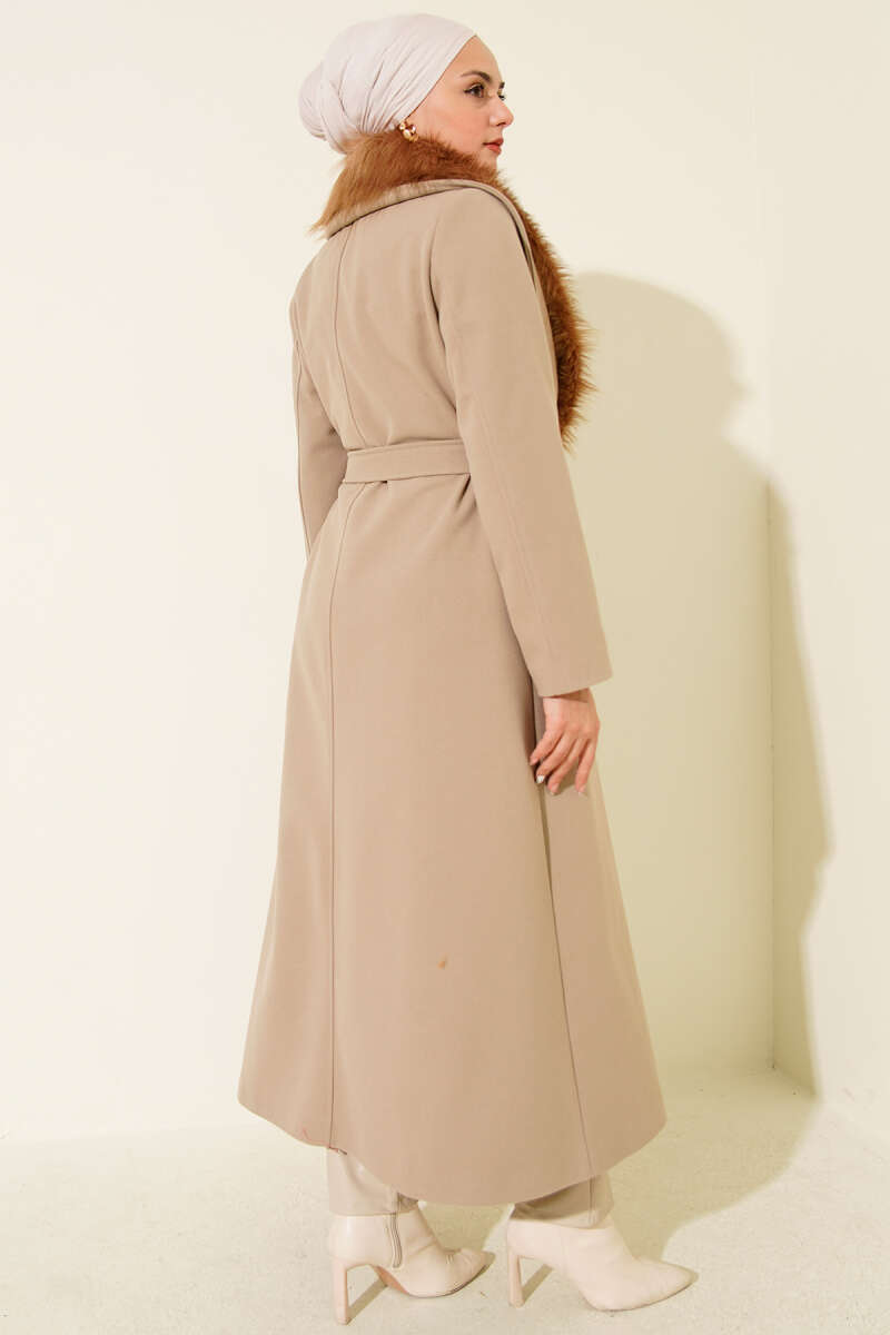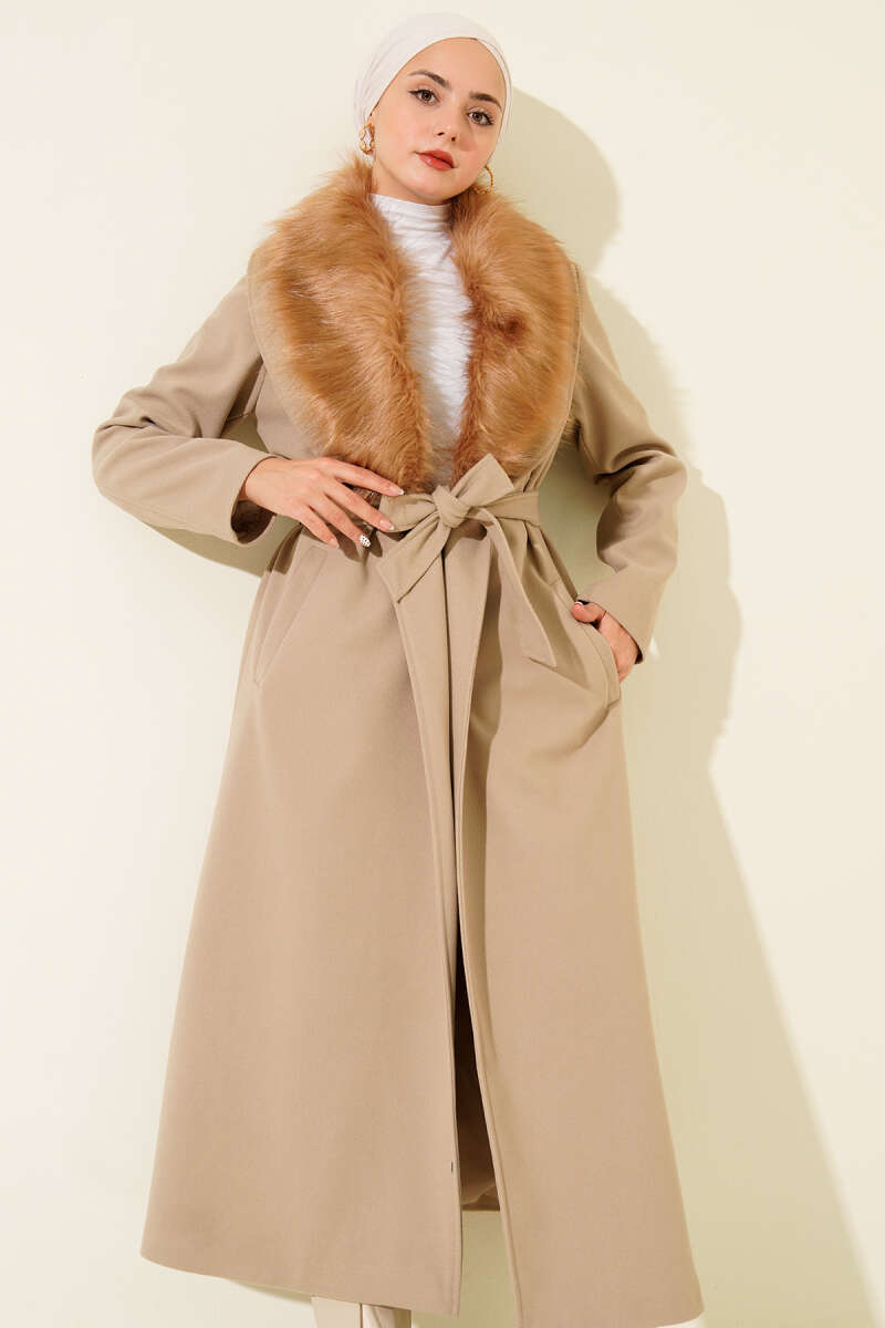 Bebe Yaka Kuşaklı Kaşe Kaban Taba