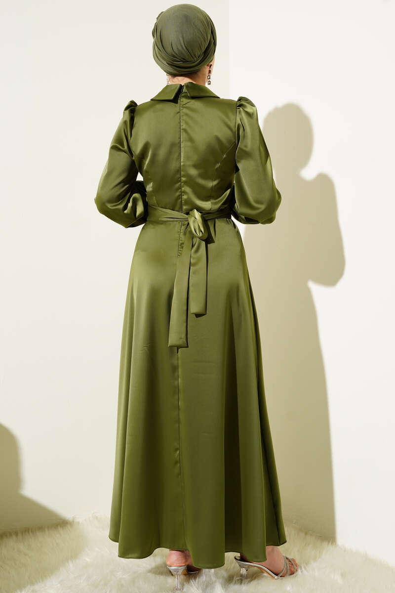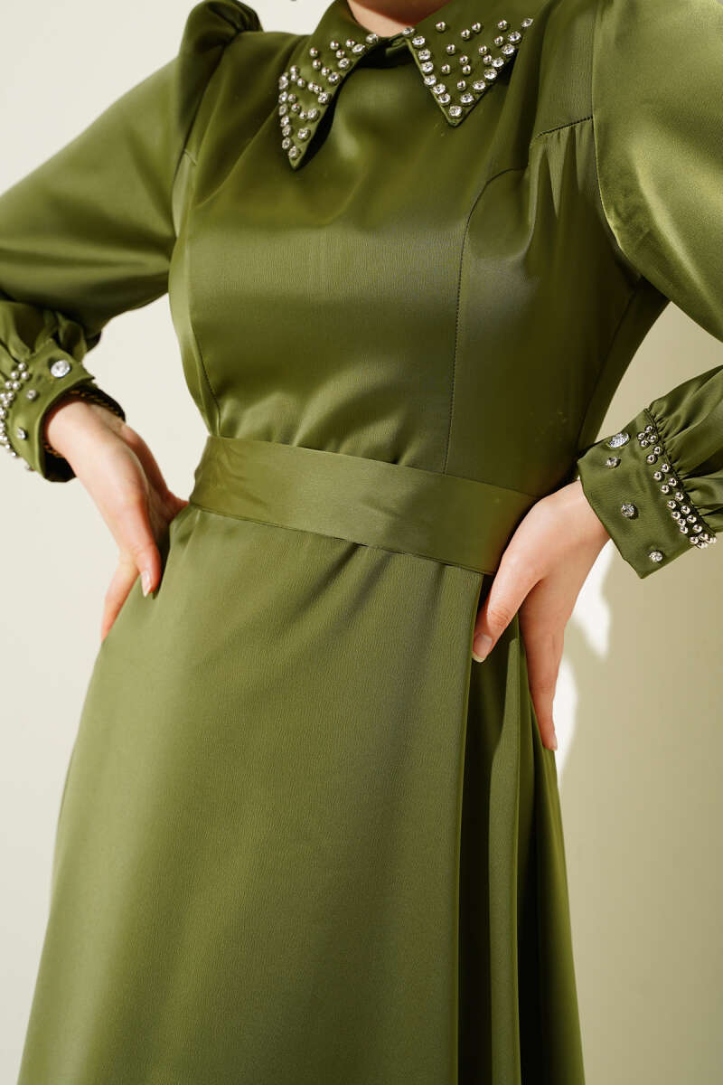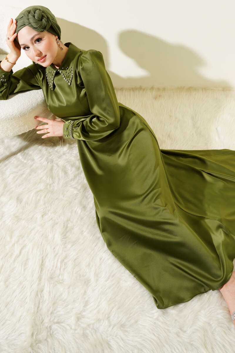 Önü Büzgülü Pul Payet Abiye Elbise Haki