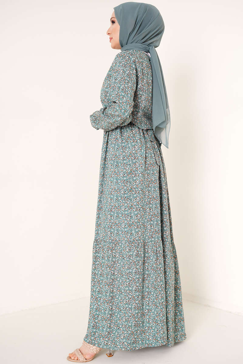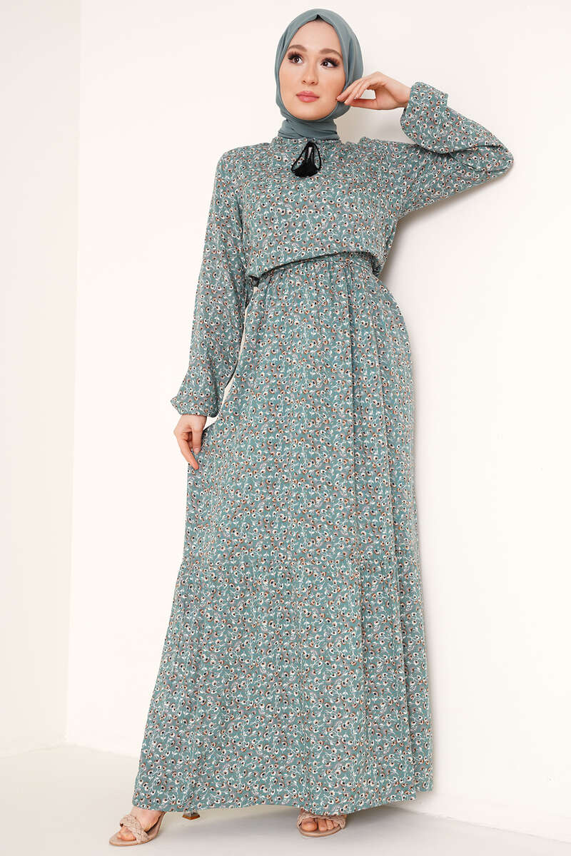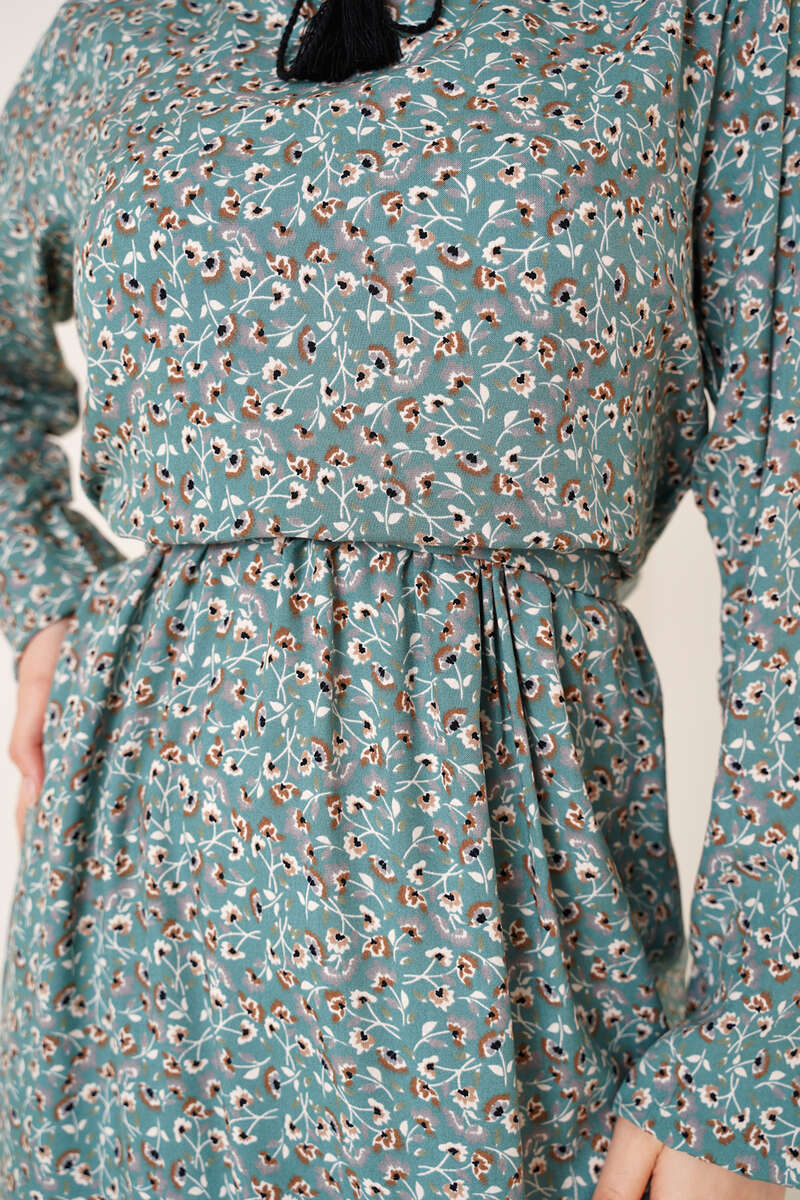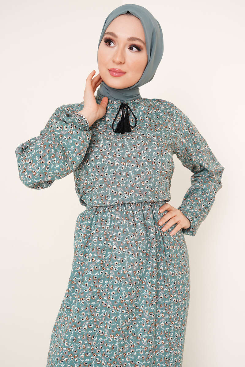 Yaka Püsküllü Çiçek Desenli Elbise Çağla Yeşili
