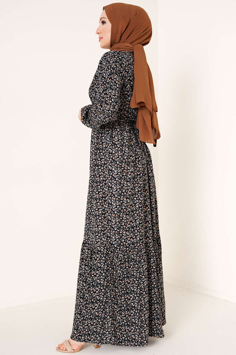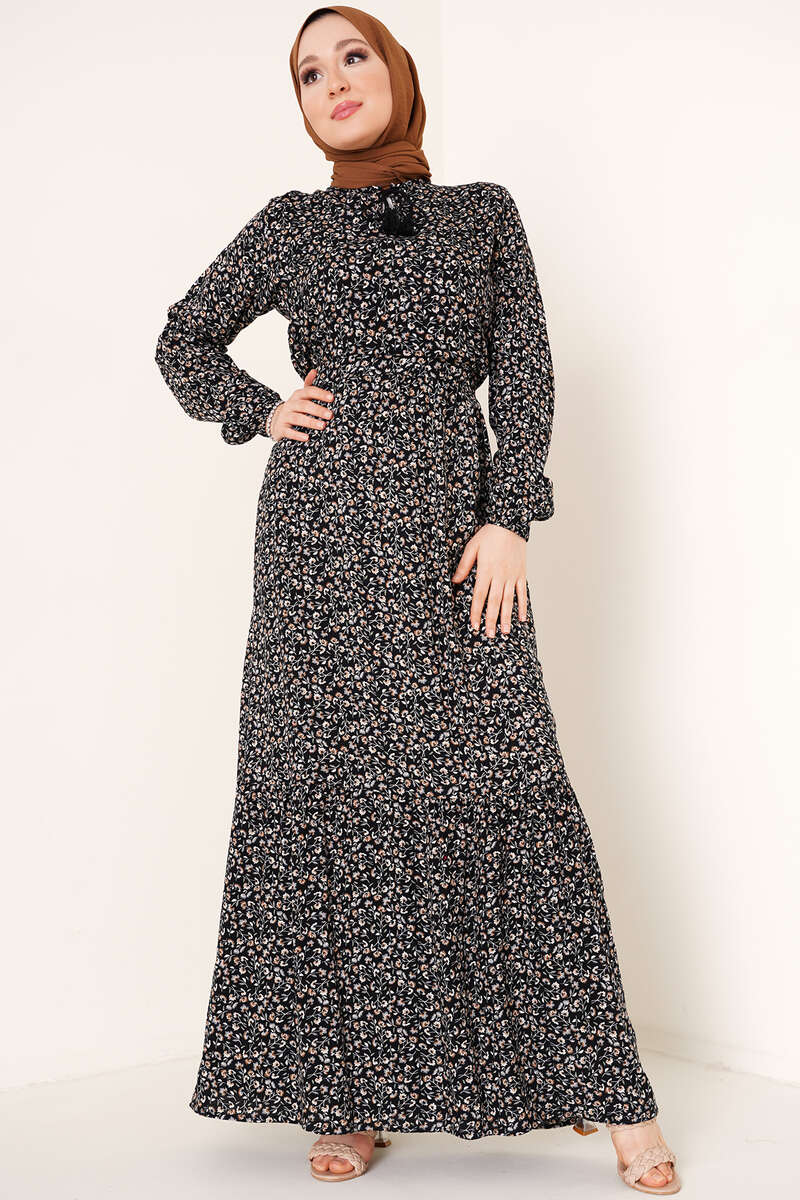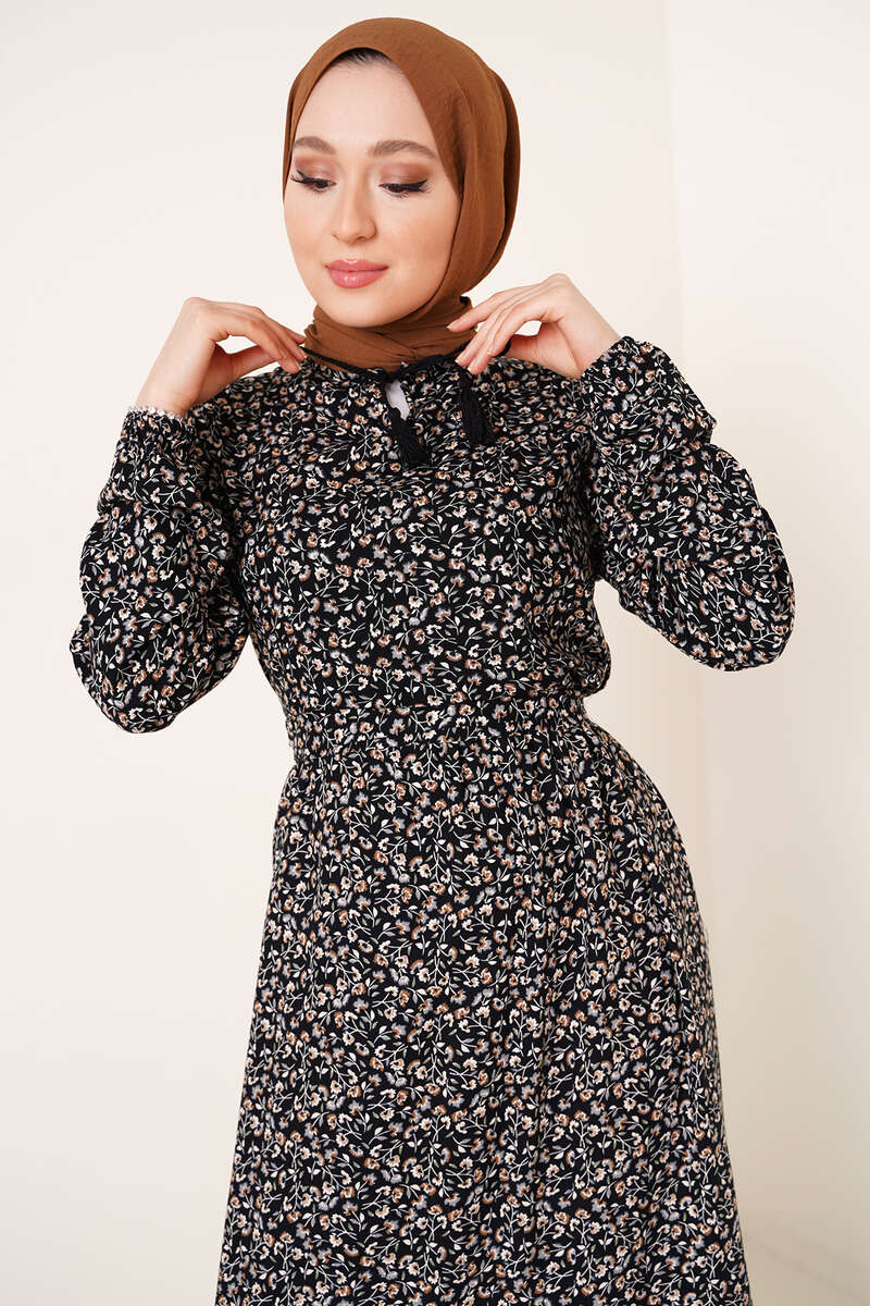 Yaka Püsküllü Çiçek Desenli Elbise Siyah