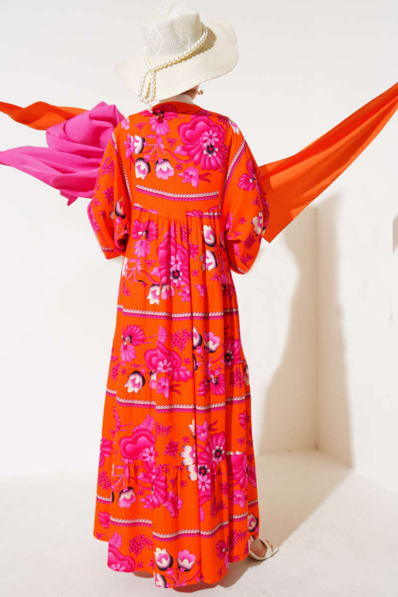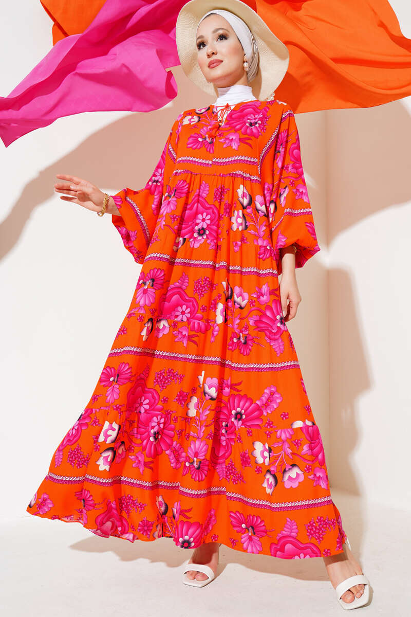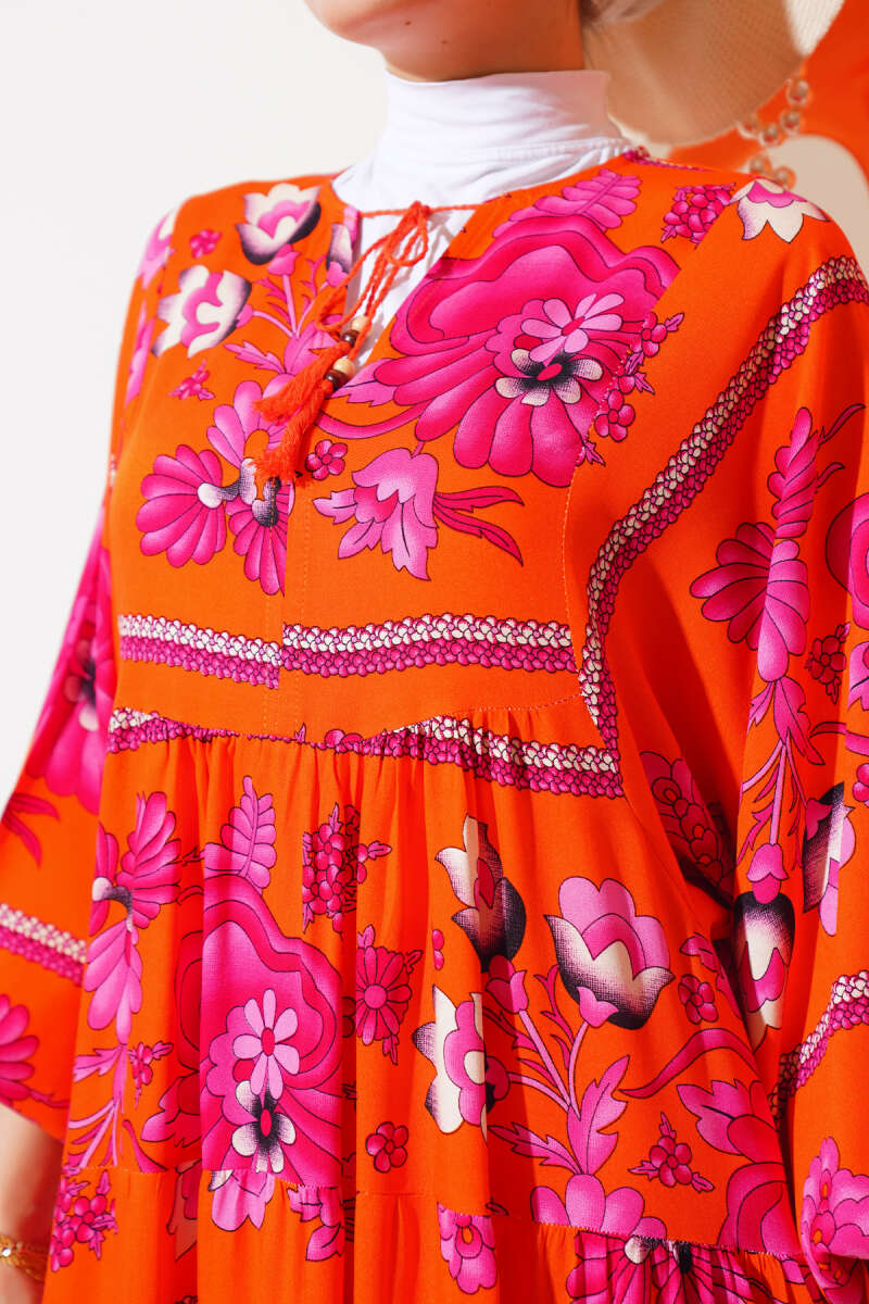 Yaka Püsküllü Desenli Elbise Turuncu