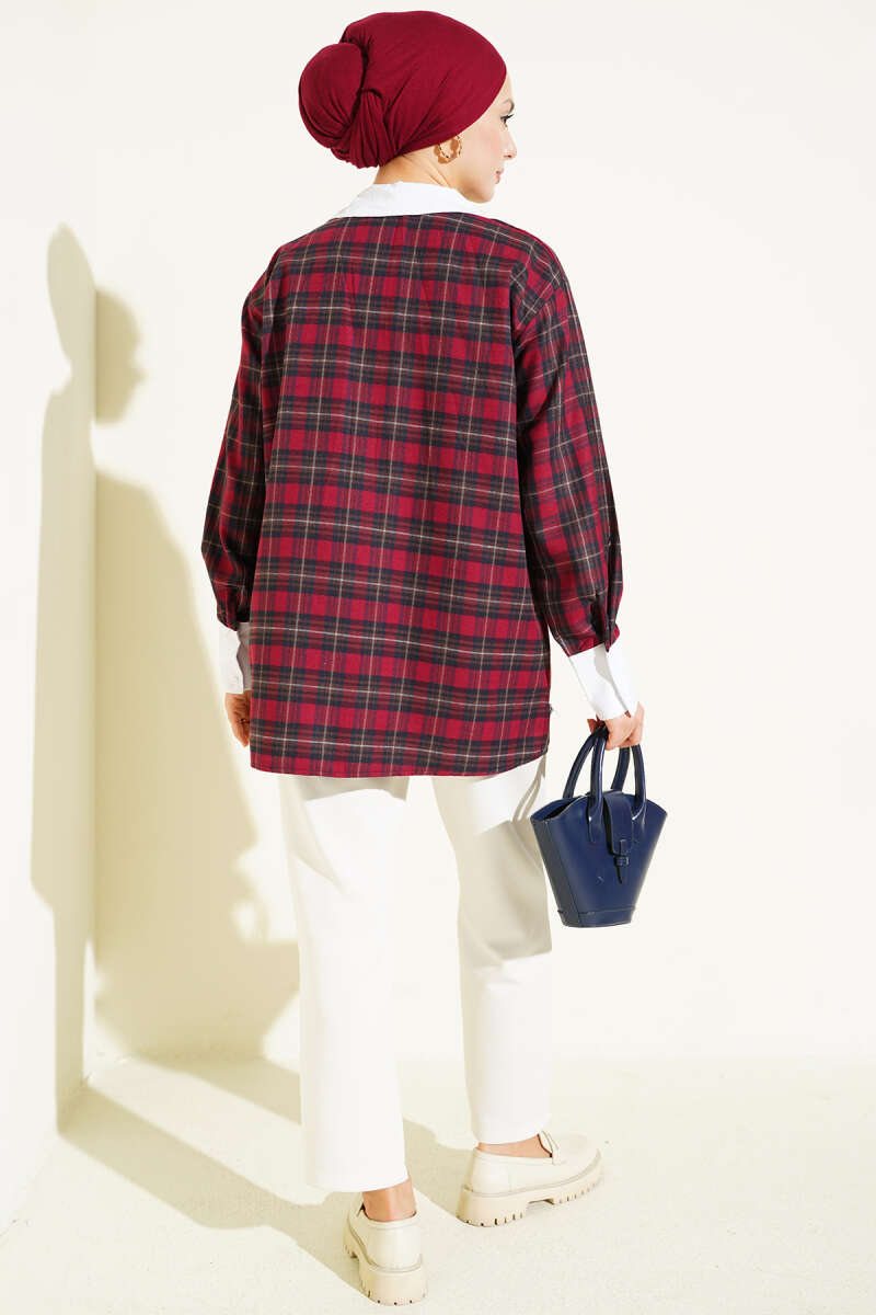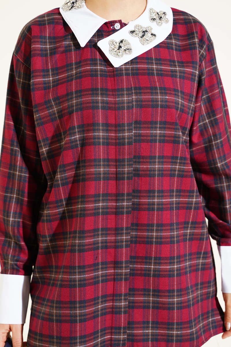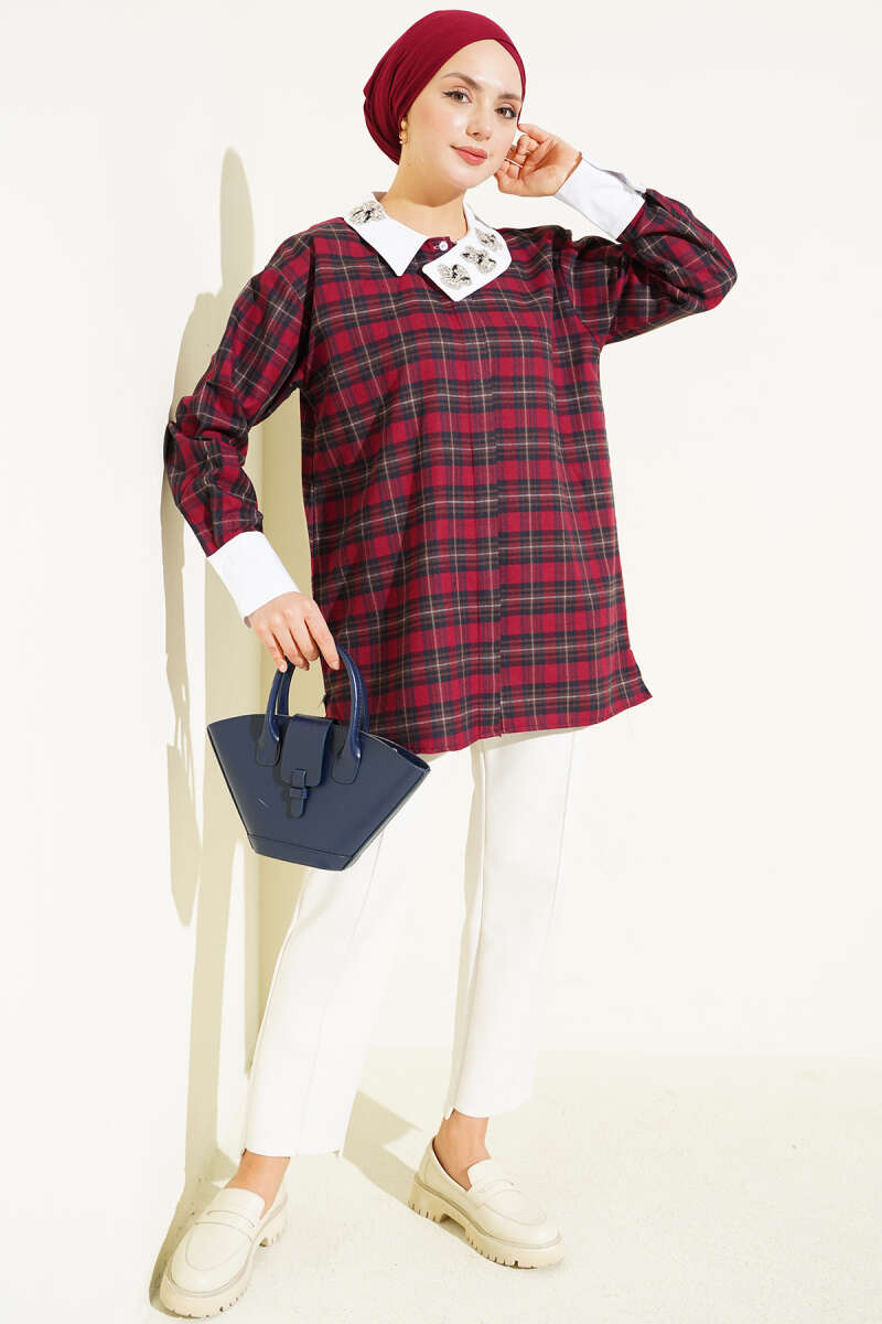 Yaka Taşlı Ekose Desen Gömlek Bordo