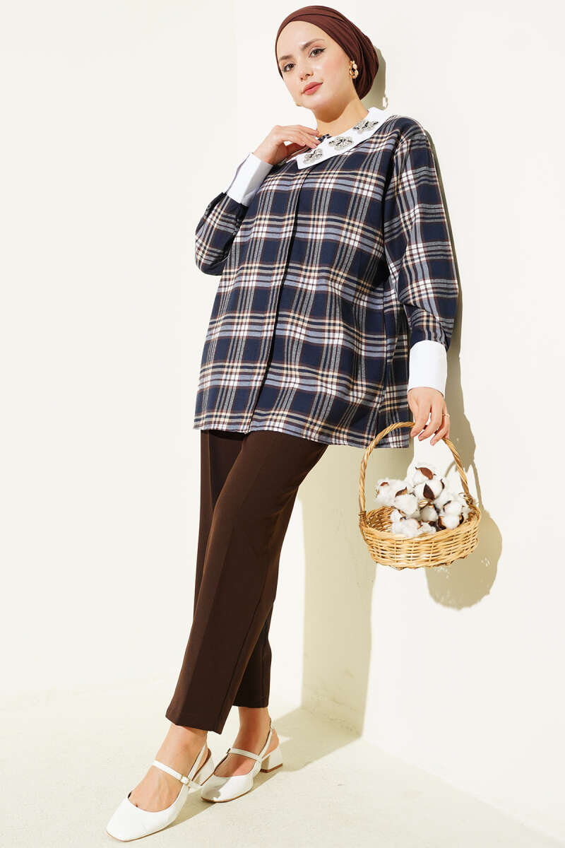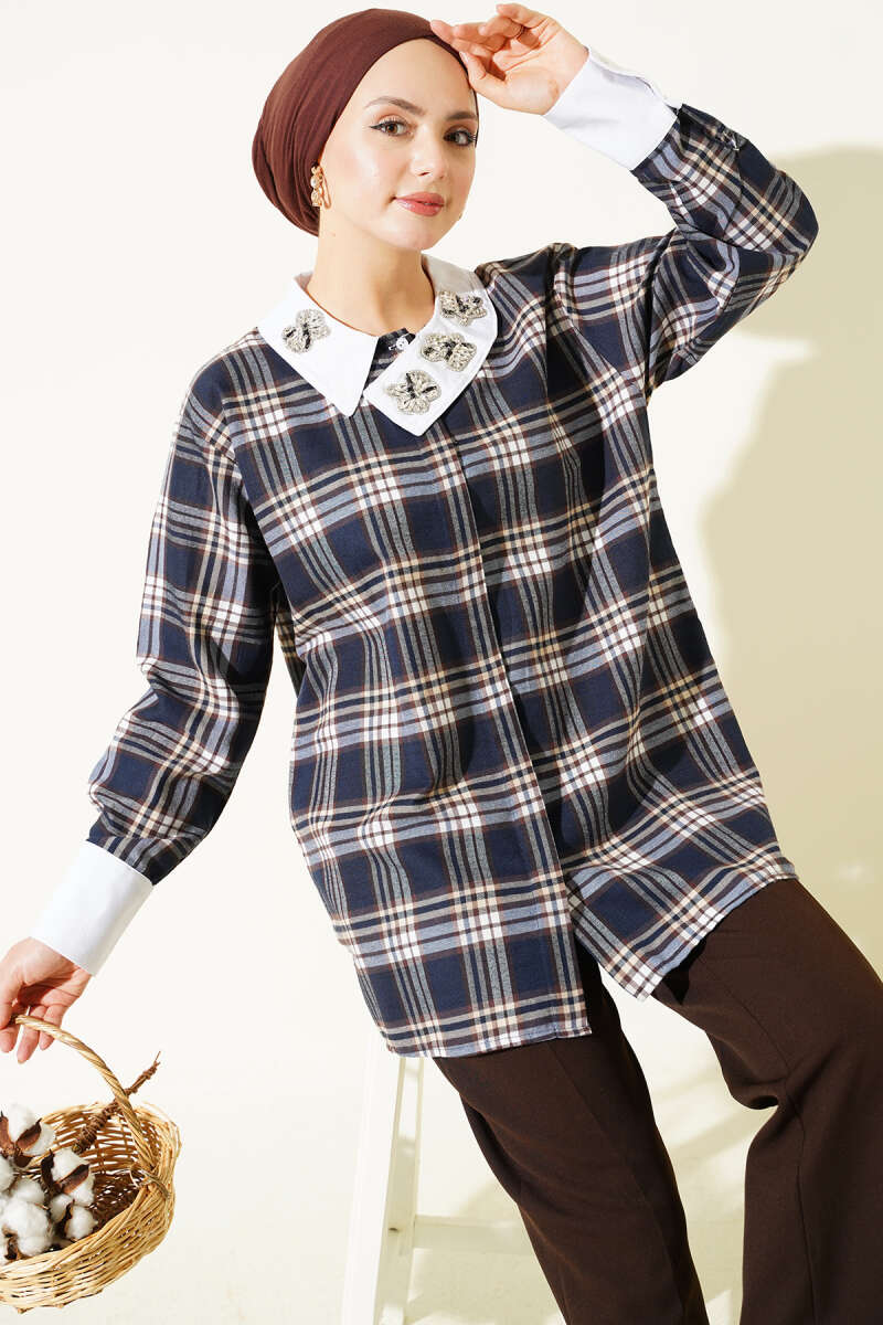 Yaka Taşlı Ekose Desen Gömlek Lacivert