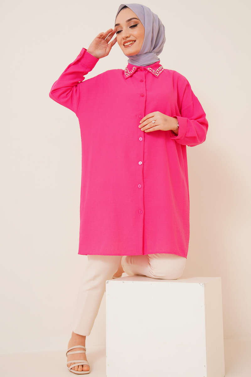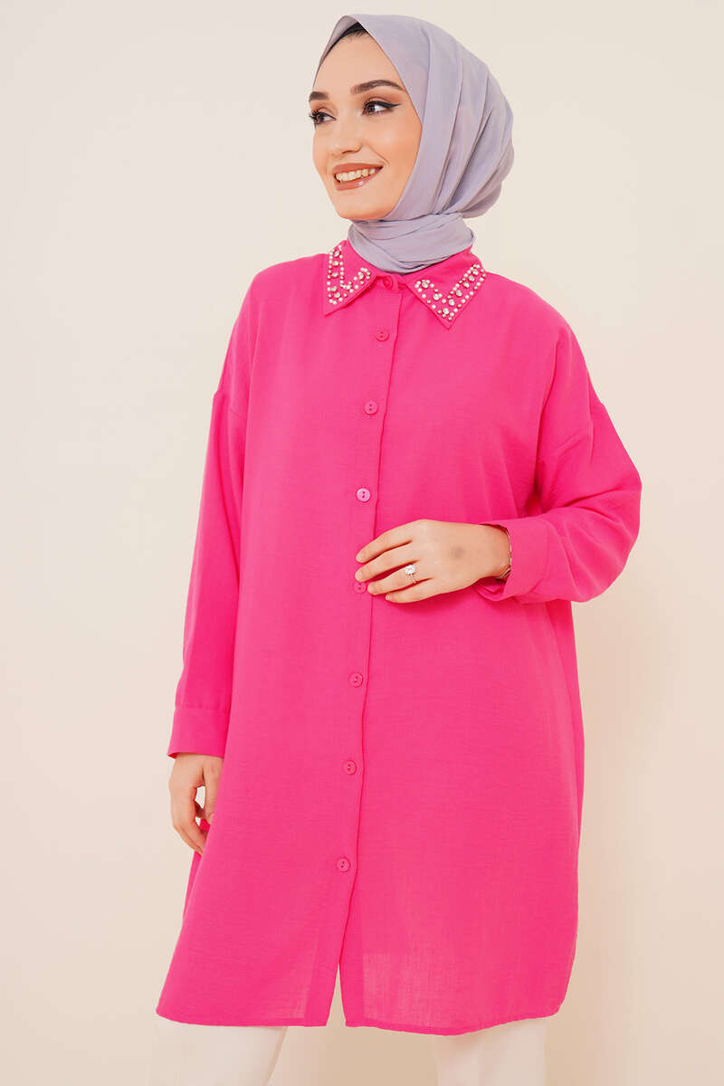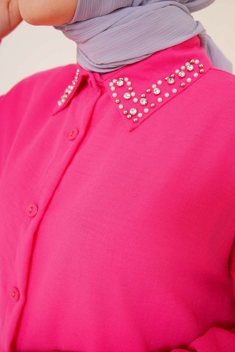 Yeni sezon gömleğimiz şık duruşu ve rahat kombinlenişiyle beğenileri üzerinde topluyor. Gömleğimiz klasik yakadır. Yakası parlak taş ve incilerle süslenen gömelğimiz düşük omuz modeldir.
