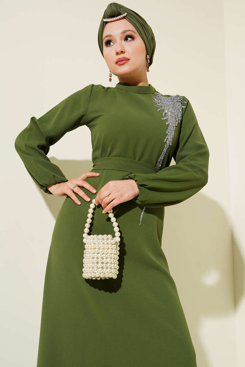 Yakası Yarım Fermuarlı Triko Elbise Yağ Yeşili