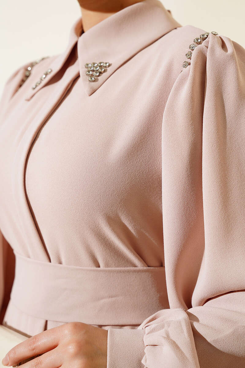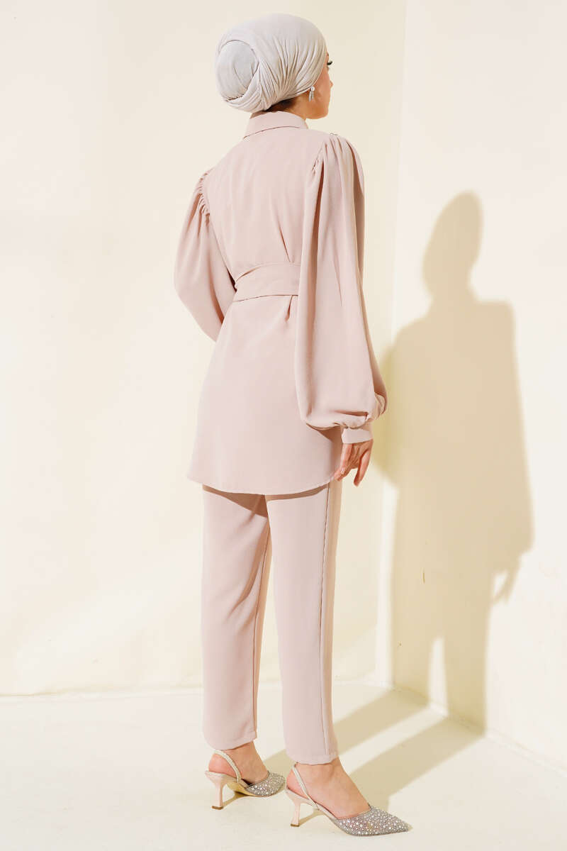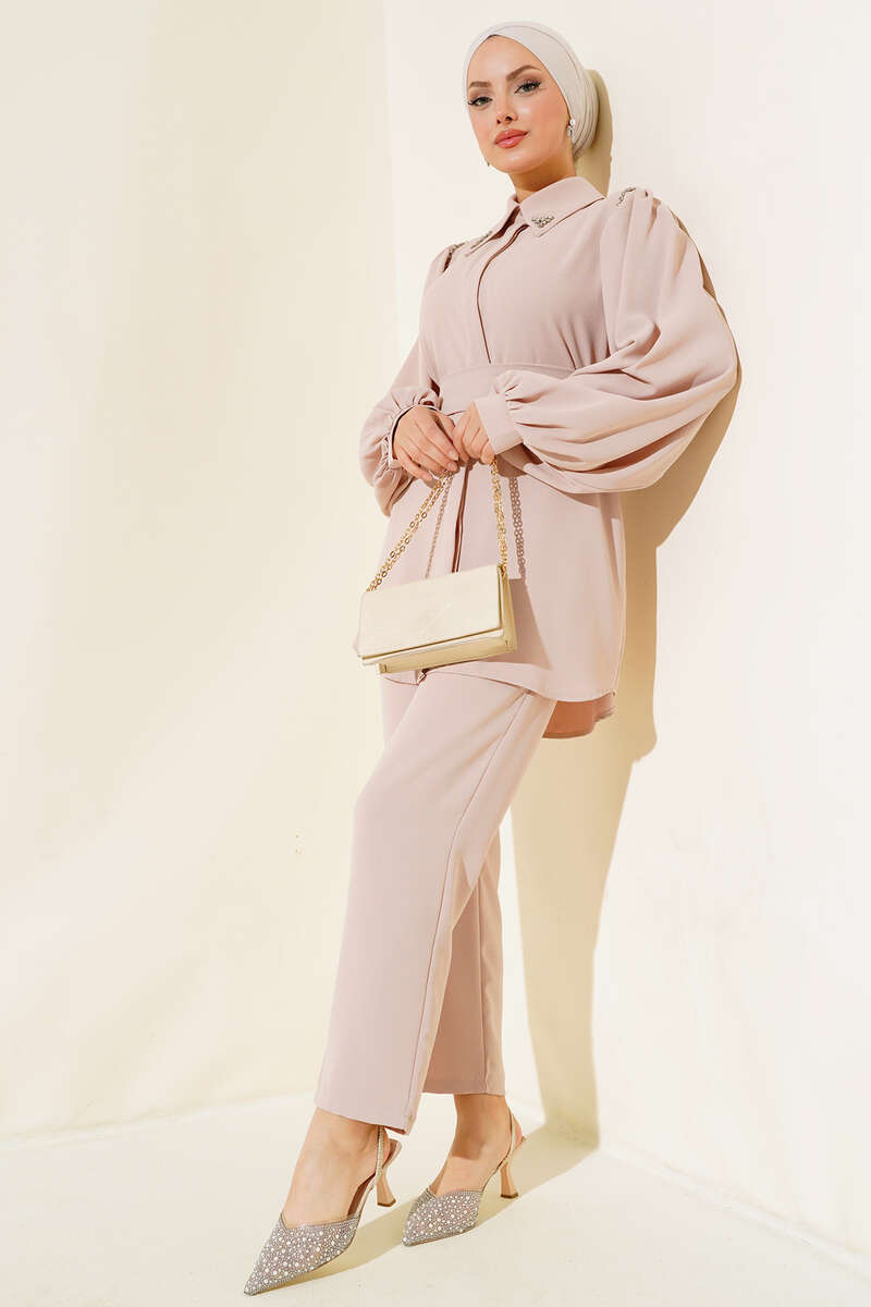 Yaka Taşlı Kuşaklı İkili Takım Bej