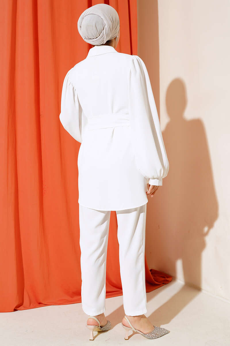 Yaka Taşlı Kuşaklı İkili Takım Beyaz