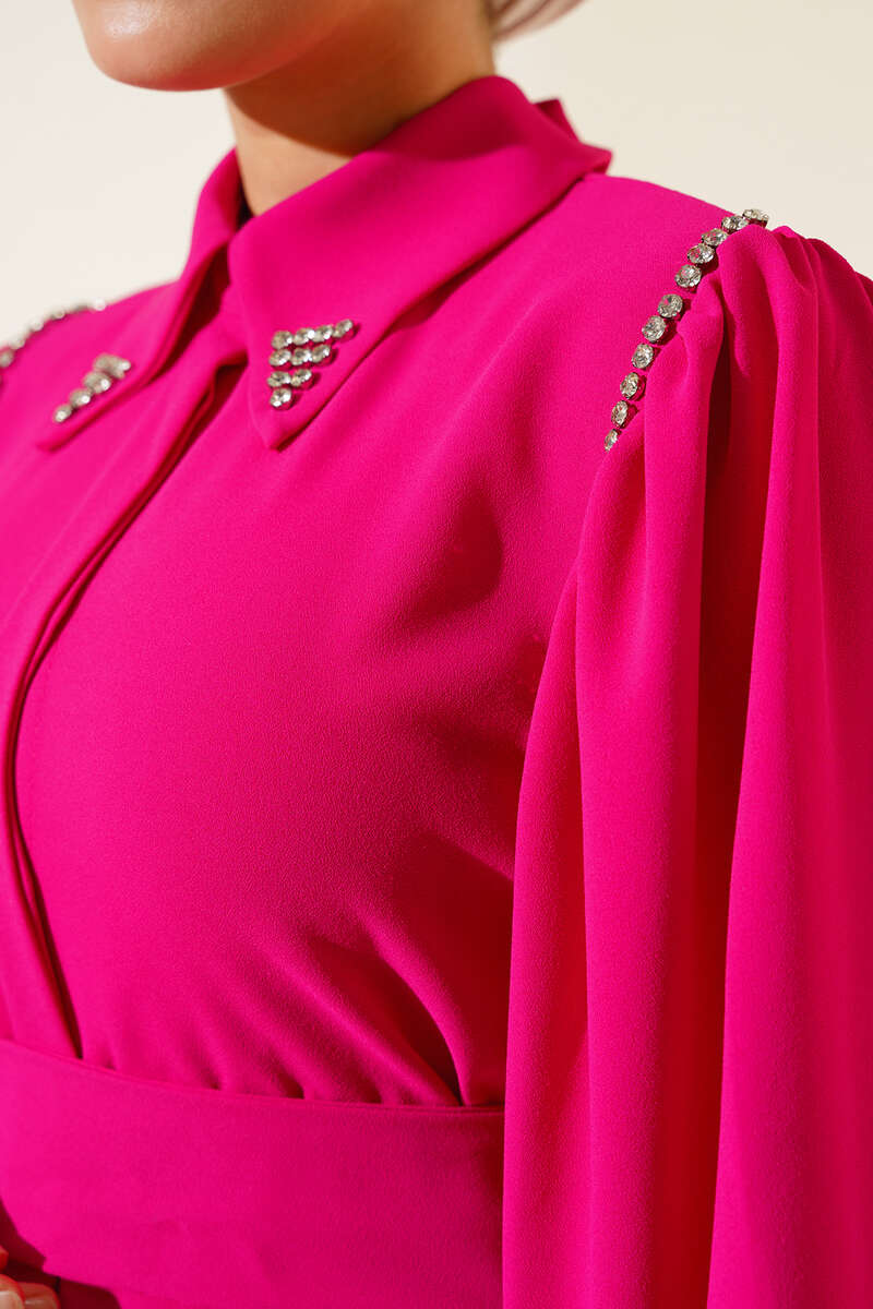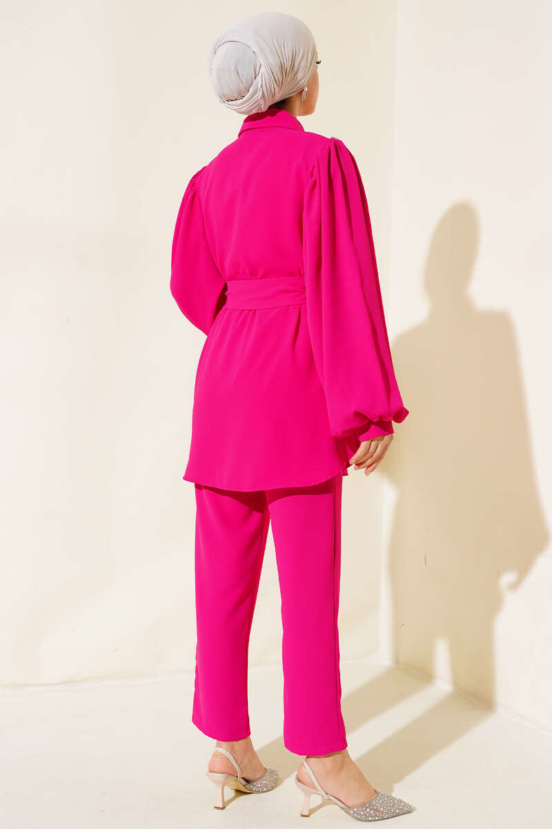 Yaka Taşlı Kuşaklı İkili Takım Fuşya