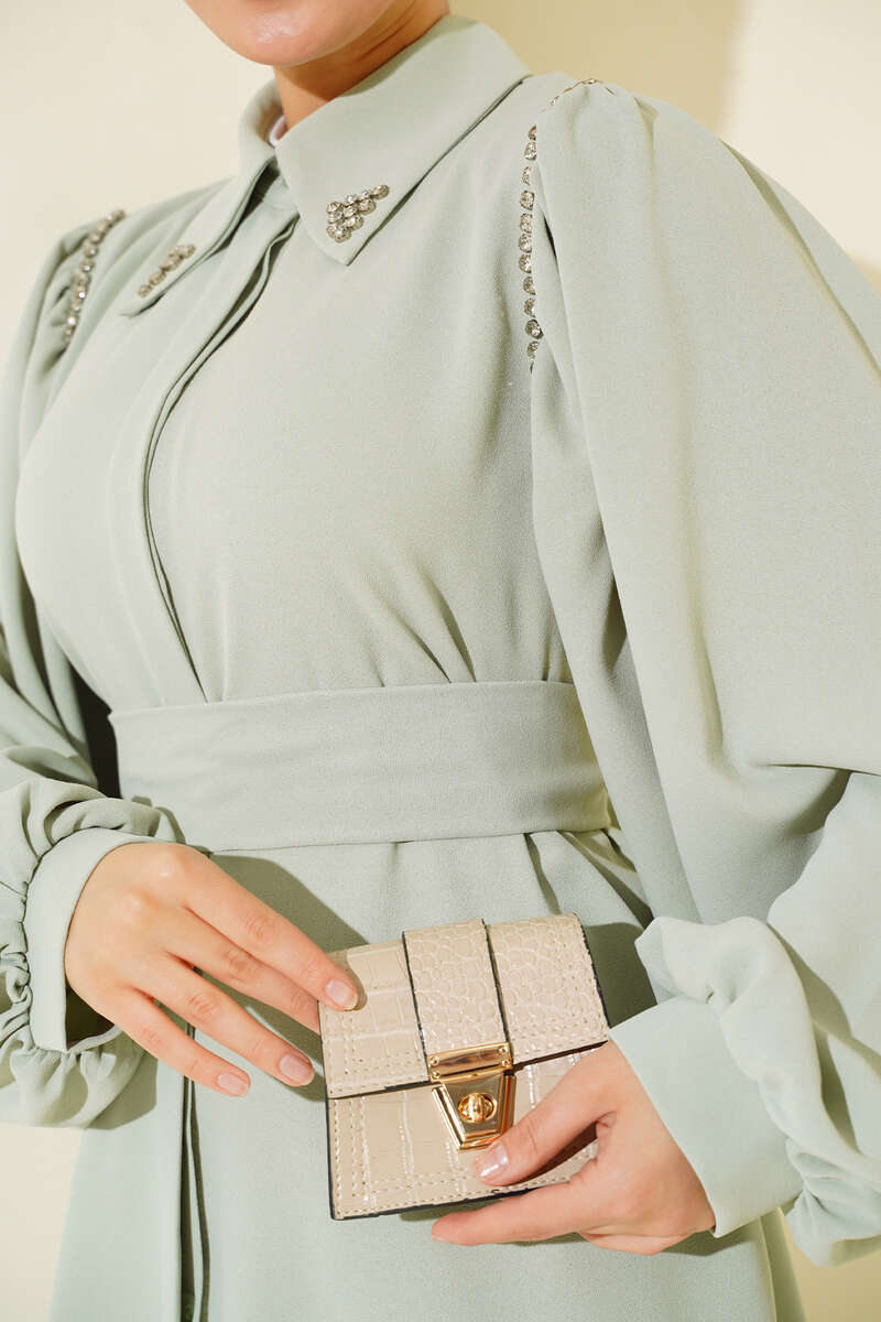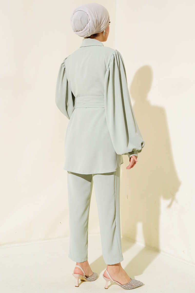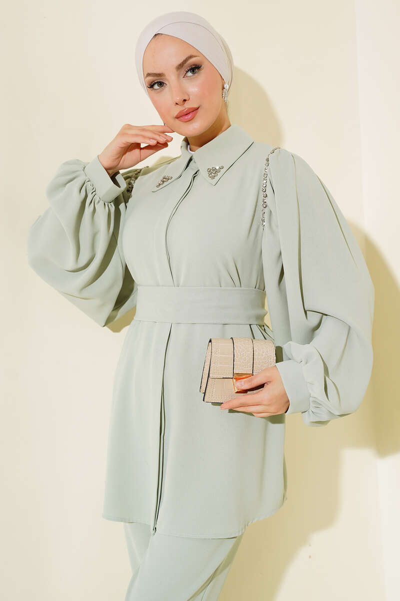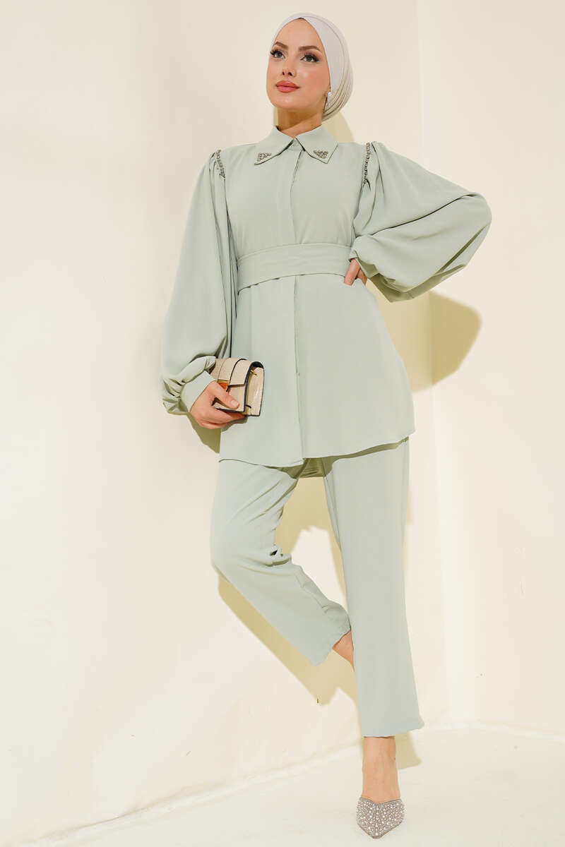 Yaka Taşlı Kuşaklı İkili Takım Mint