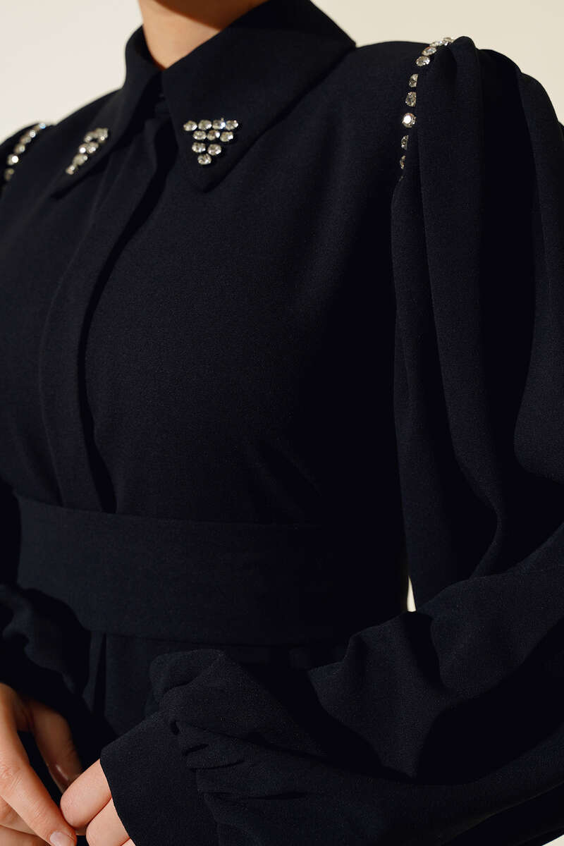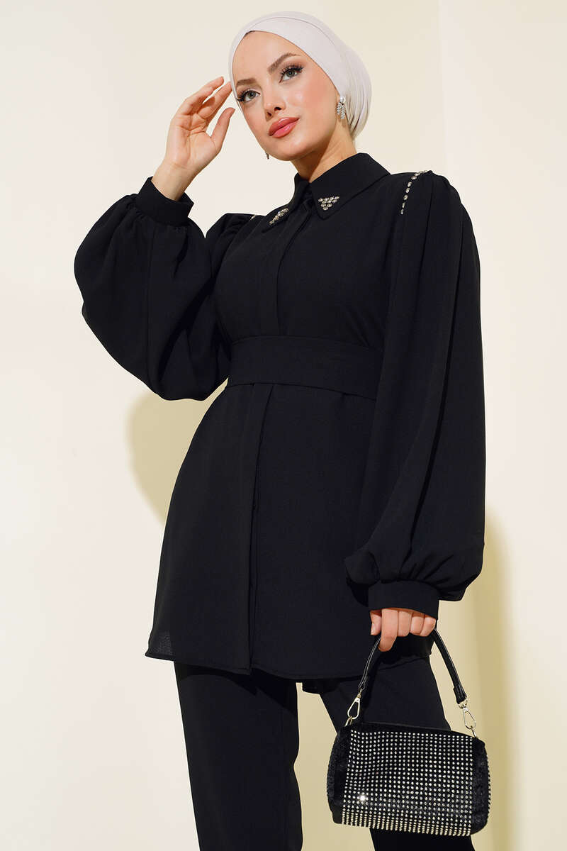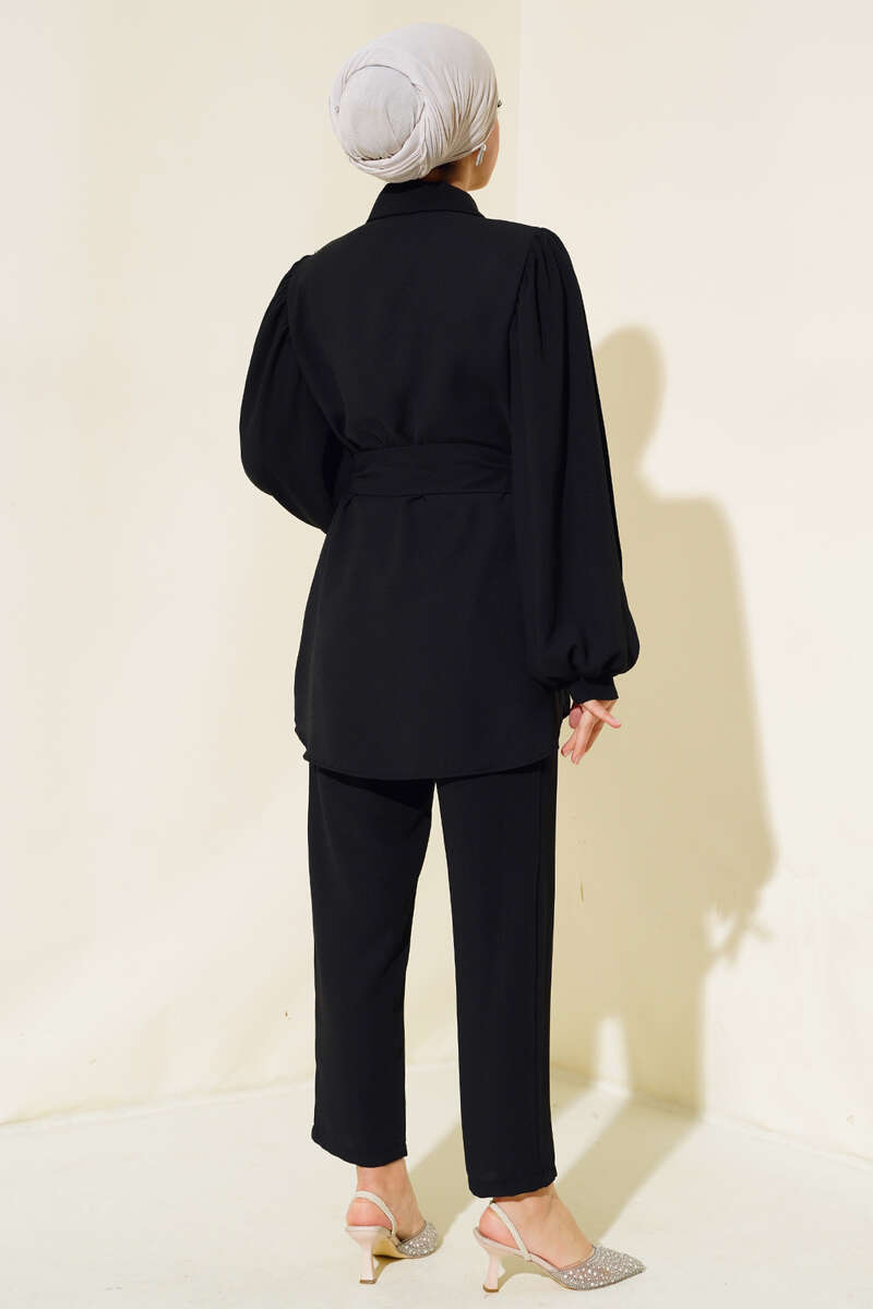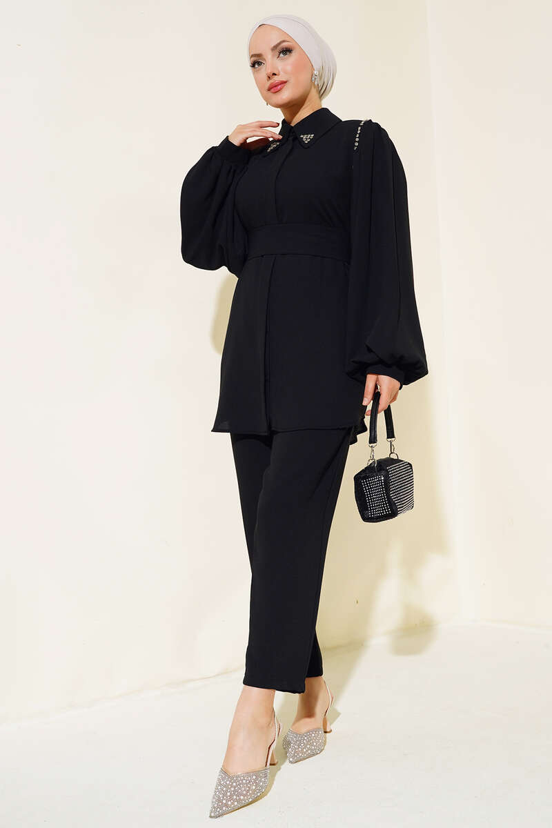 Yaka Taşlı Kuşaklı İkili Takım Siyah