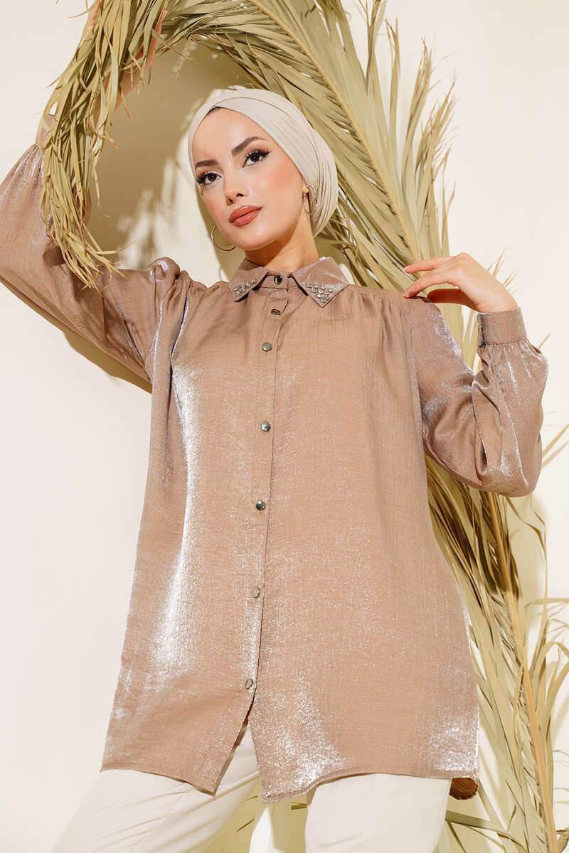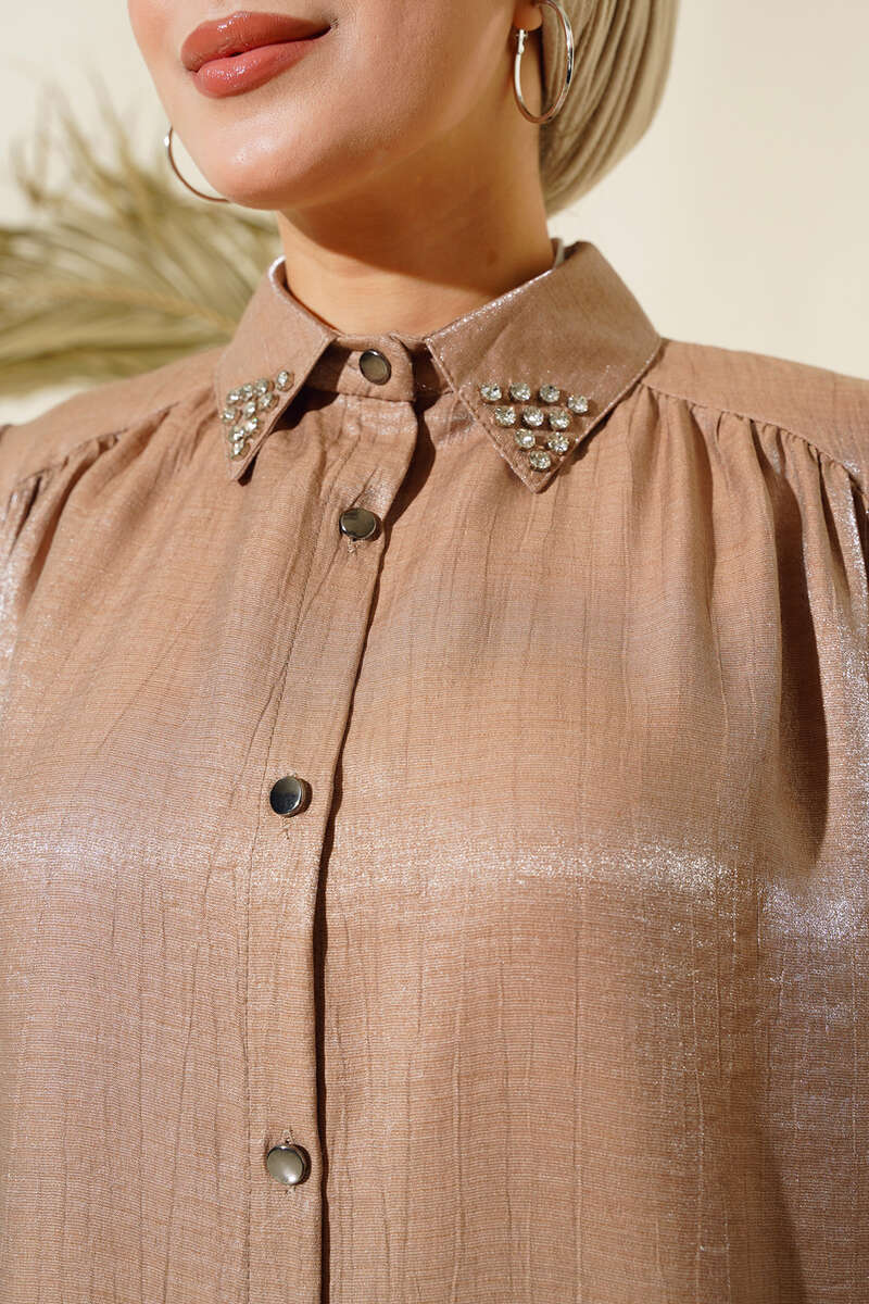 Yeni sezon saten gömlek modelimiz sizlerle beraber. Gömleğimize parlak saten kumaşı hareketlilik kazandırmıştır. Gömleğimizin yakasında taşlı işlemeler bulunur. Kol bilekleri parlak düğmelidir. Gömleğimiz boydan düğmelidir. Salaş bir yapıya sahiptir. Gömleğimiz şık duruşuyla kombinlerinizin vazgeçilmezi olacaktır. Renk seçeneklerimiz mevcuttur.