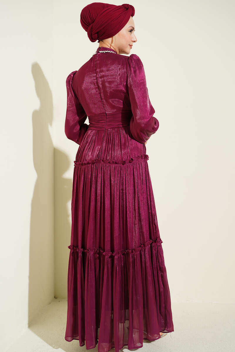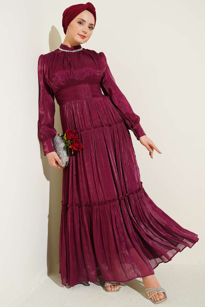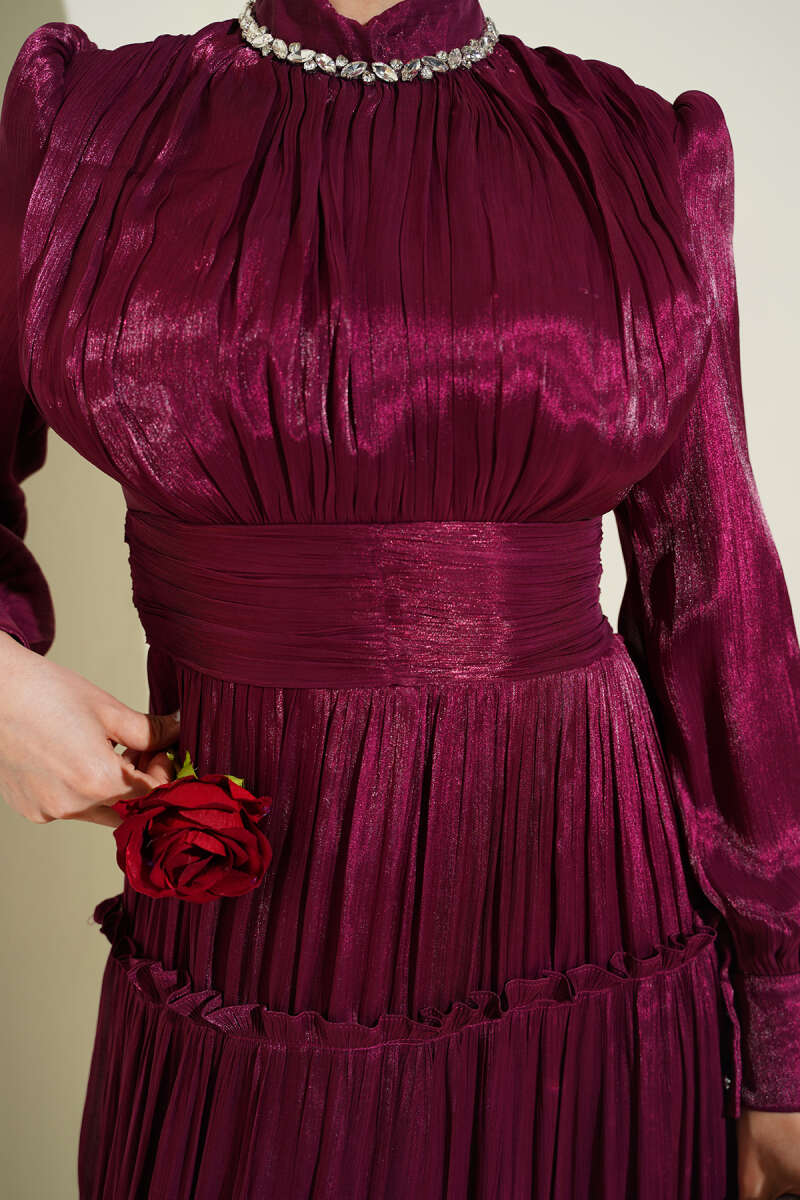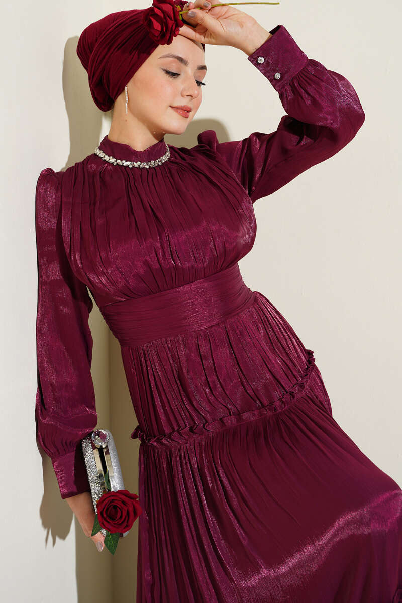 Yaka Taşlı Pileli Abiye Elbise Bordo