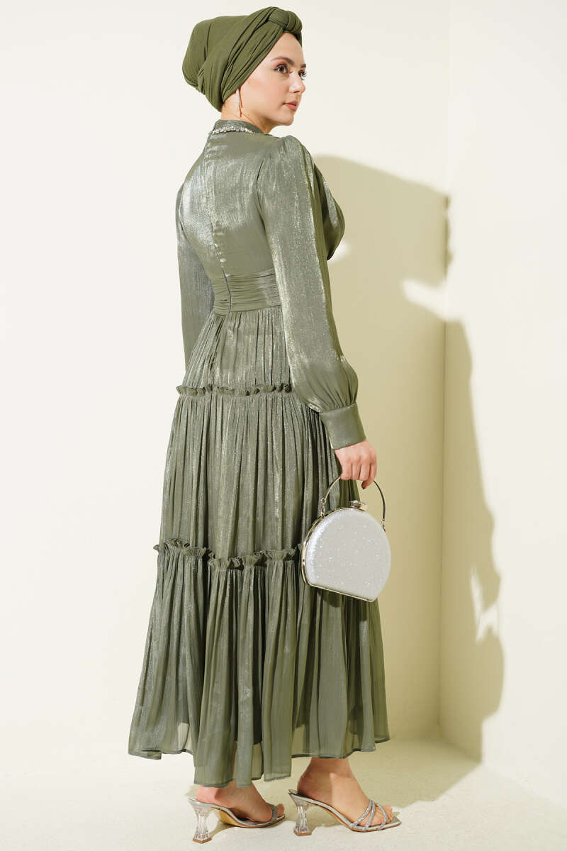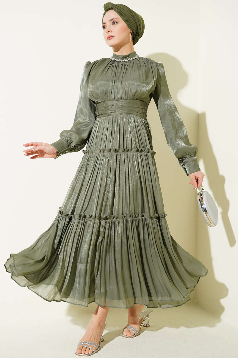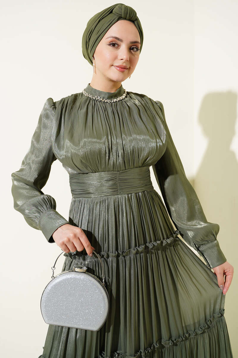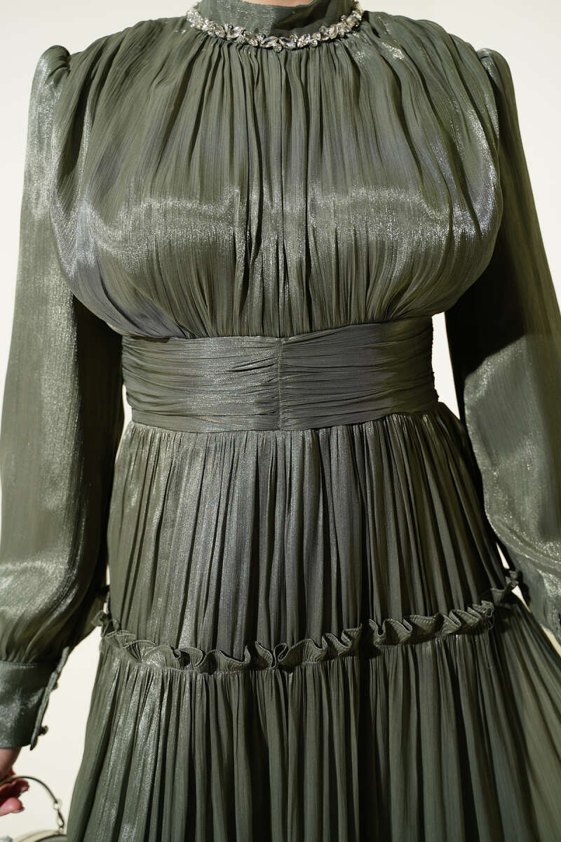 Yaka Taşlı Pileli Abiye Elbise Haki