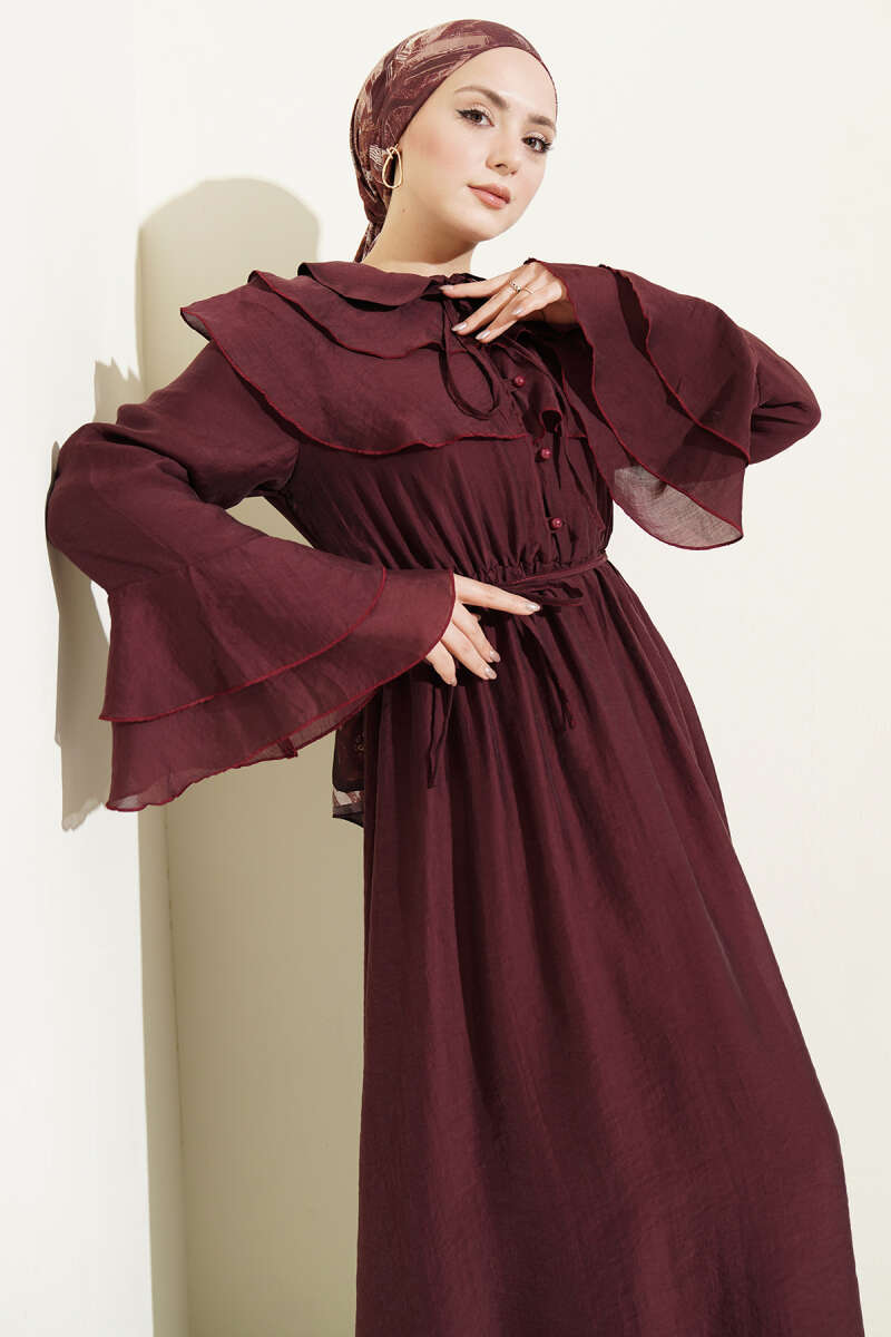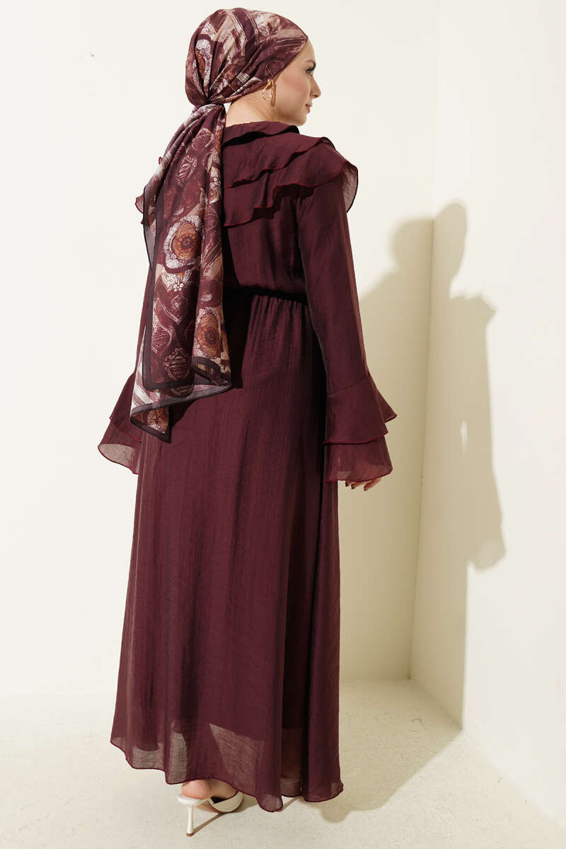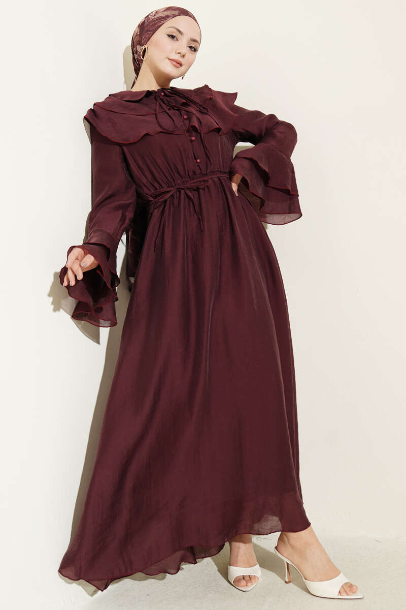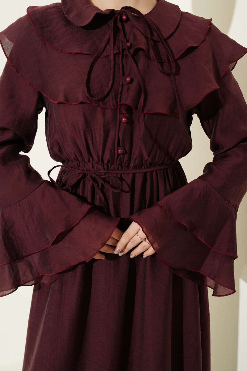 Yaka ve Bilek Fırfırlı Düğmeli Elbise Bordo