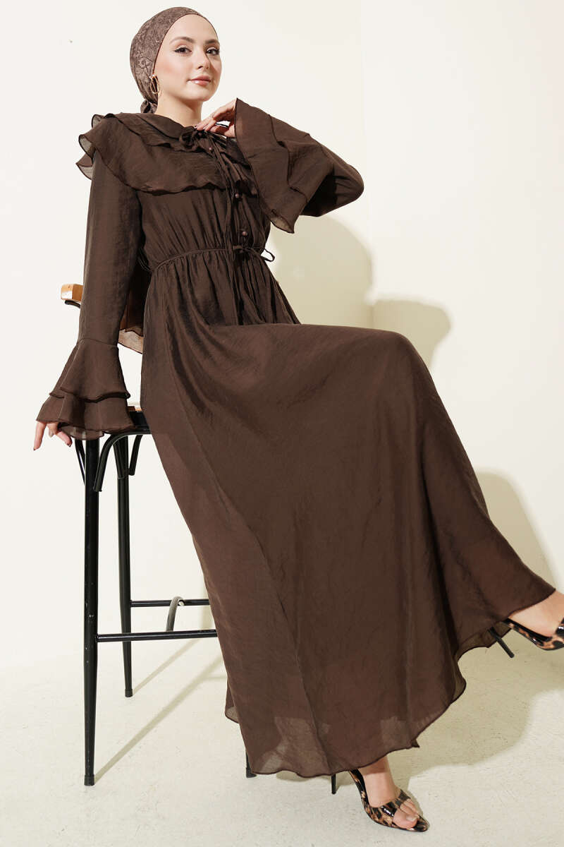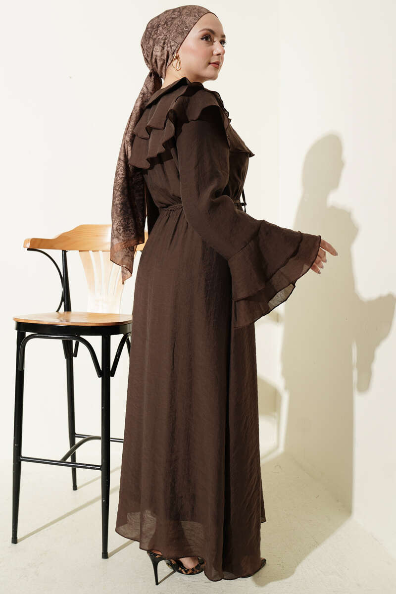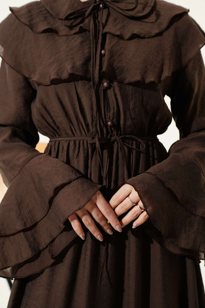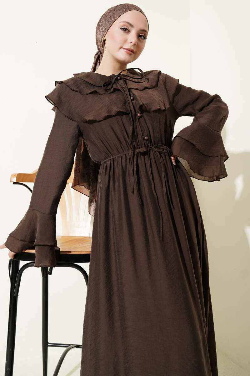 Yaka ve Bilek Fırfırlı Düğmeli Elbise Kahve