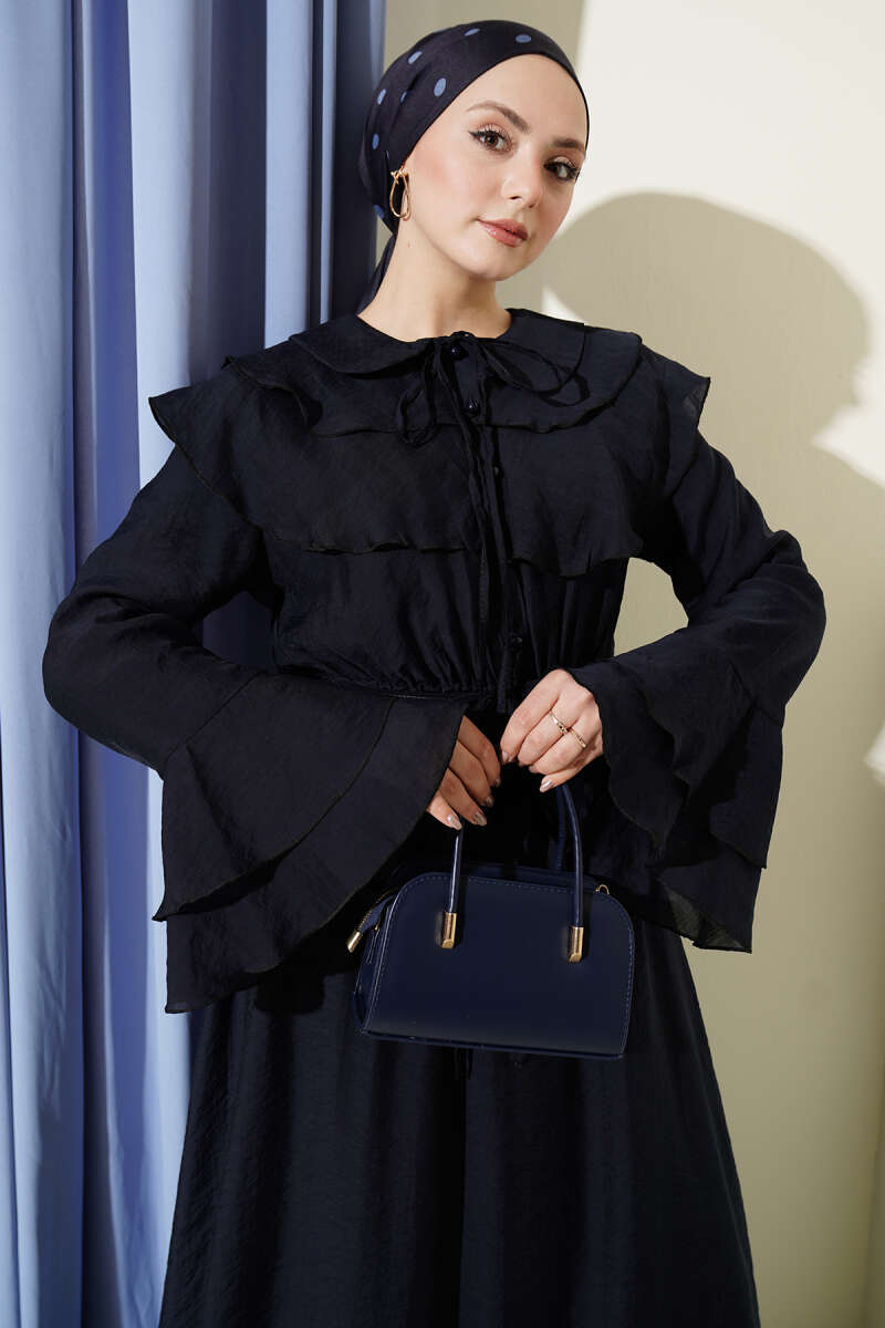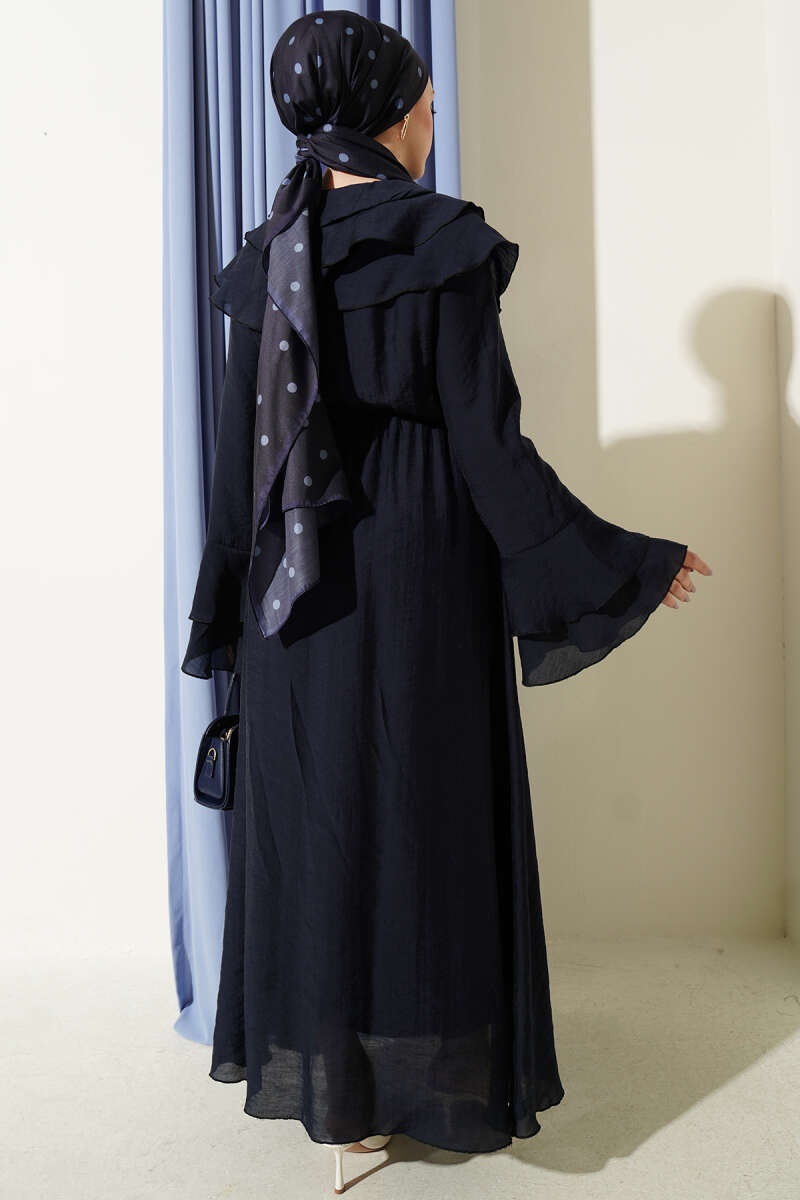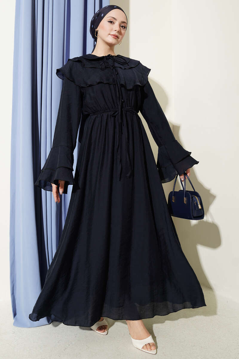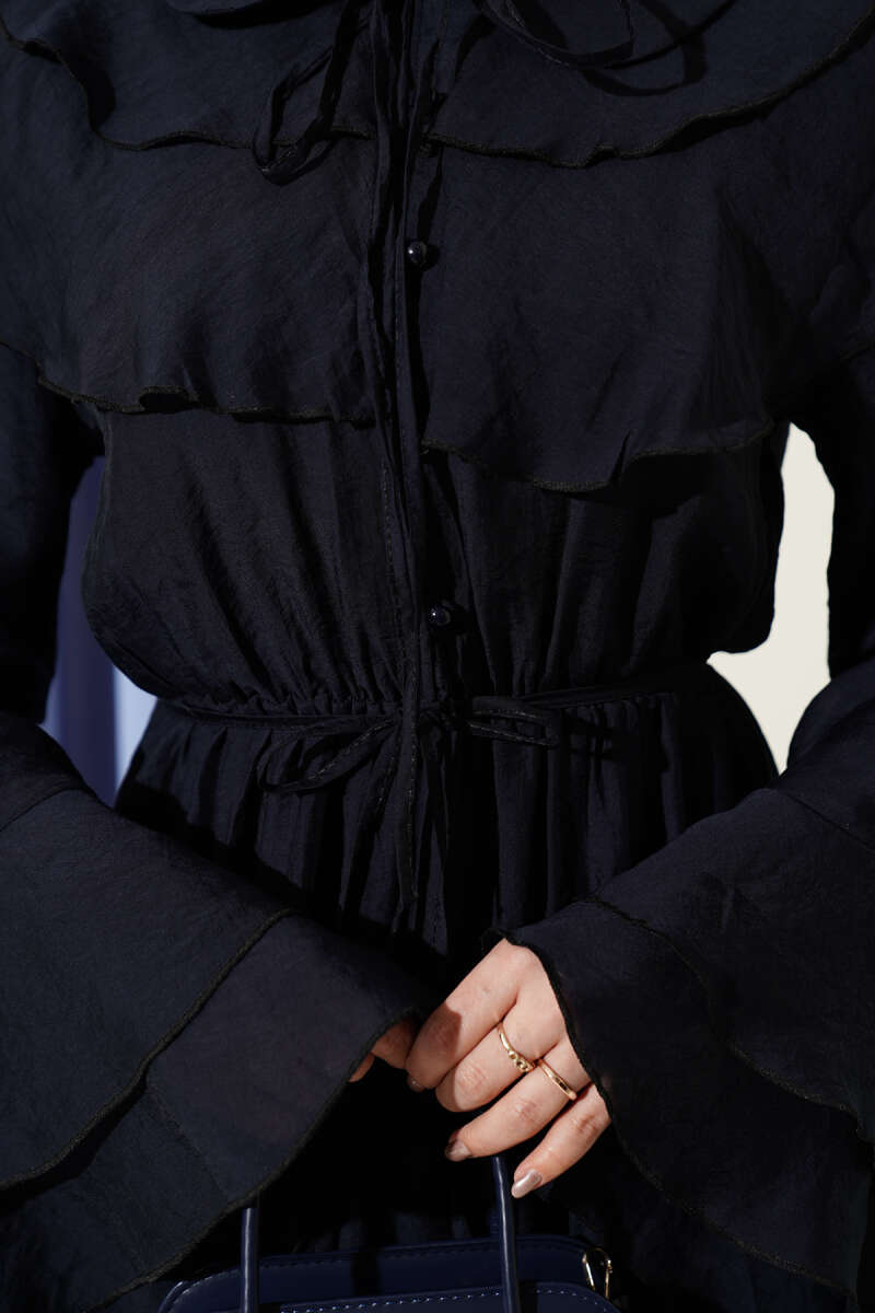 Zarif yaka tasarımı ve kollarındaki katlı fırfır detaylarıyla romantik bir stil sunan bu elbise, dökümlü kumaşı sayesinde gün boyu konforlu bir şıklık vadeder. Bel kısmındaki büzgü detayı silüetinizi naifçe vurgularken, boydan düğmeli yapısı tasarıma hem fonksiyonellik hem de klasik bir hava katar. Hafif ve akışkan dokusuyla hareket özgürlüğü sağlayan bu parça, özel günlerden günlük buluşmalara kadar her ortamda asil bir duruş sergilemenize yardımcı olur. İnce işçiliği ve modern kesimiyle gardırobunuzun en feminen ve kurtarıcı modellerinden biri olmaya adaydır.