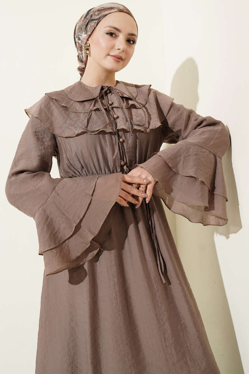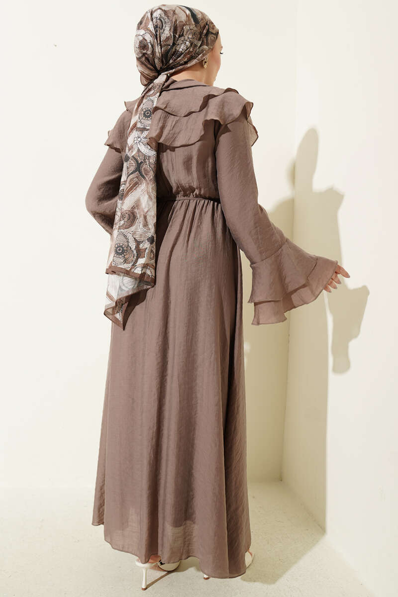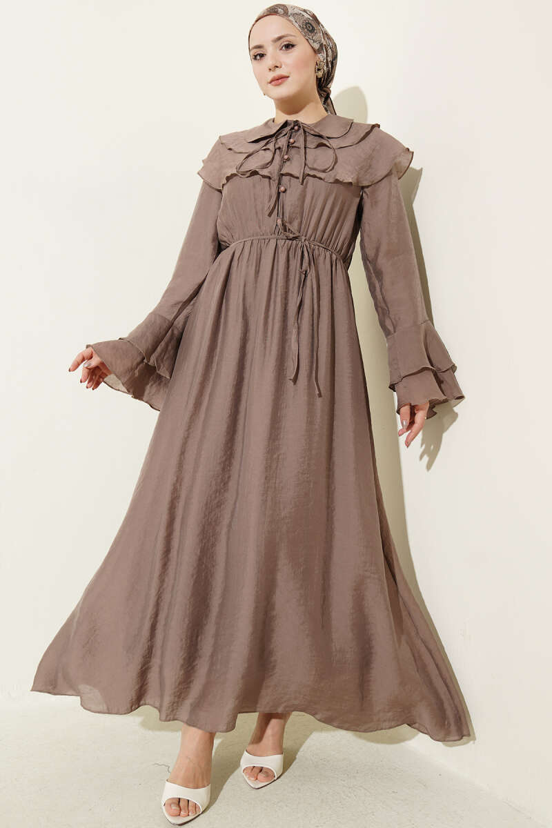 Yaka ve Bilek Fırfırlı Düğmeli Elbise Vizon
