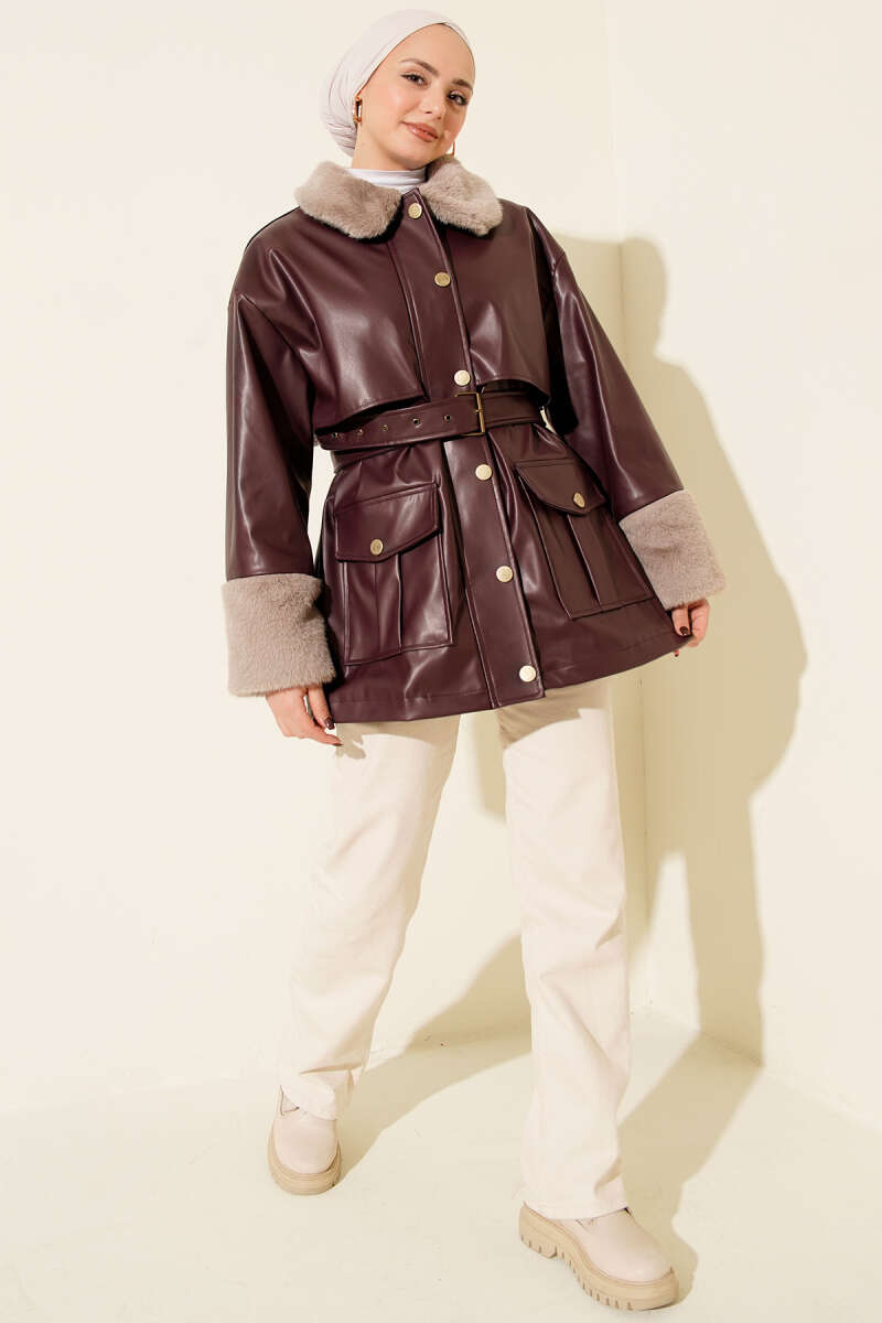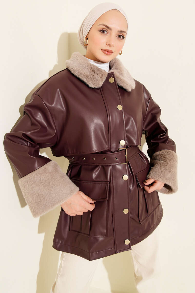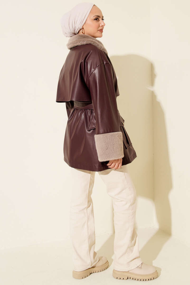 Yaka ve Bilek Kürklü Deri Ceket Kahve