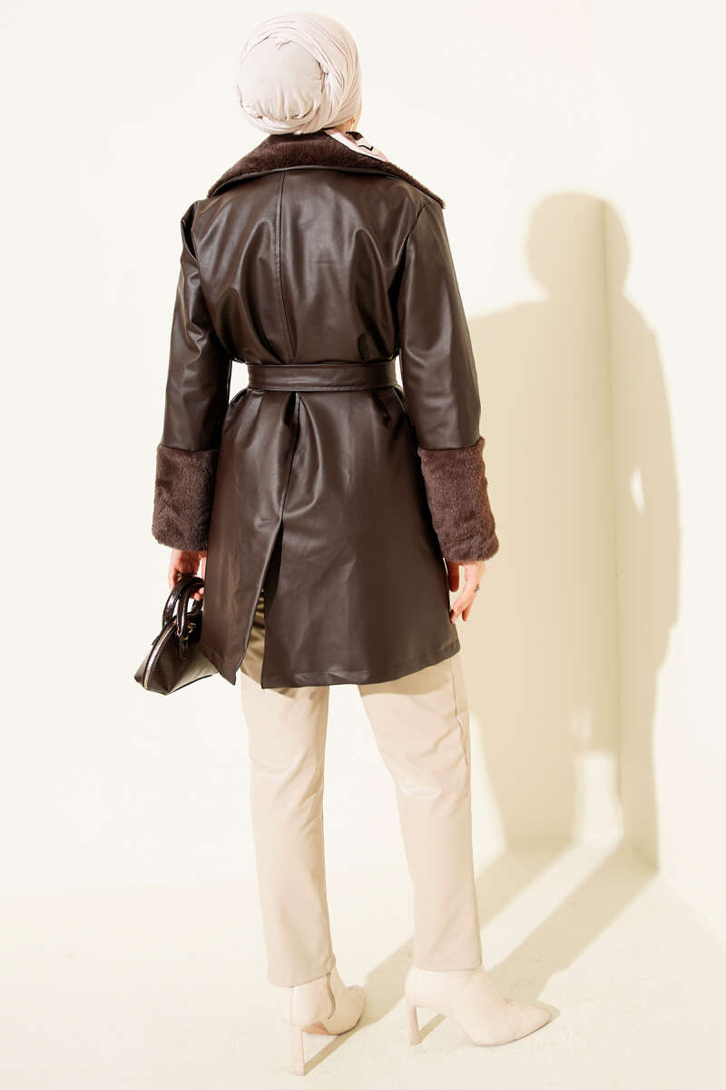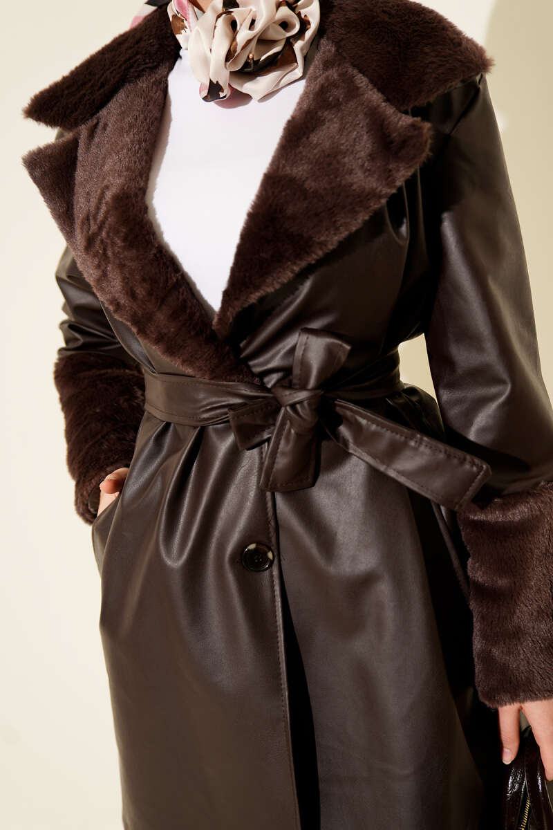 Yaka Ve Bilek Kürklü Kısa Deri Trençkot Kahve